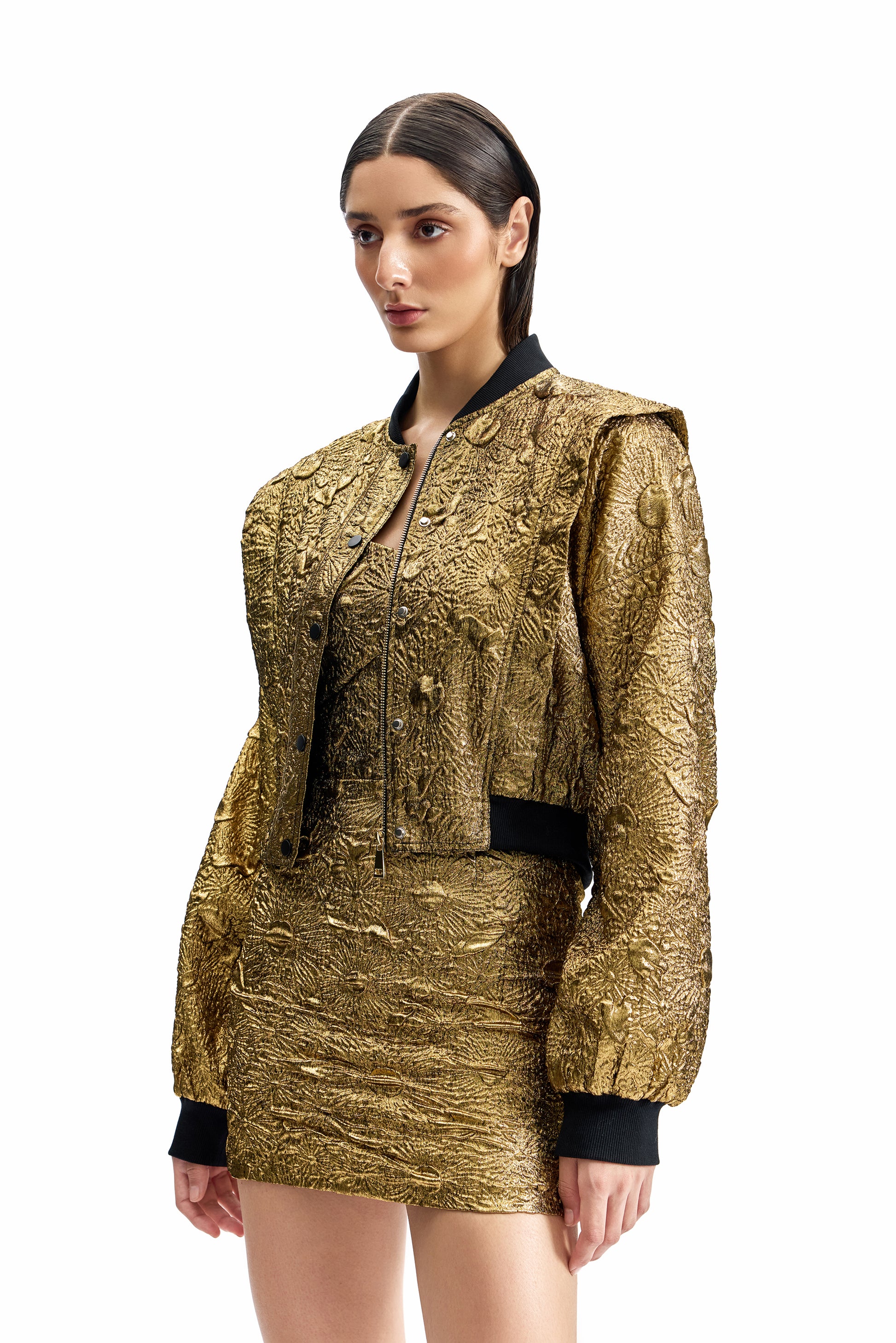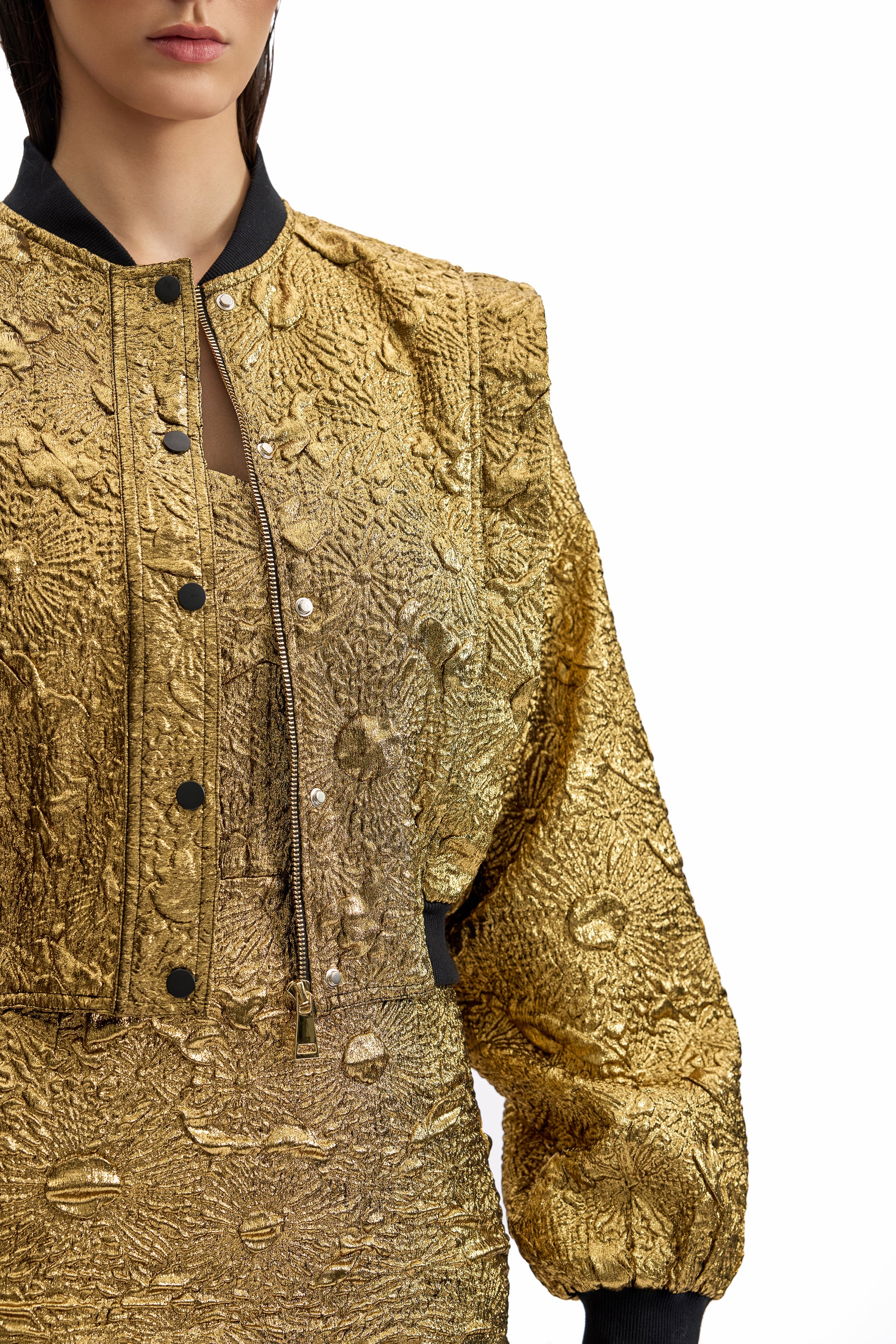 An elegant gold jacket crafted in richly textured metallic fabric, designed to elevate evening and party looks. The structured bomber silhouette balances sharp tailoring with statement luxury.