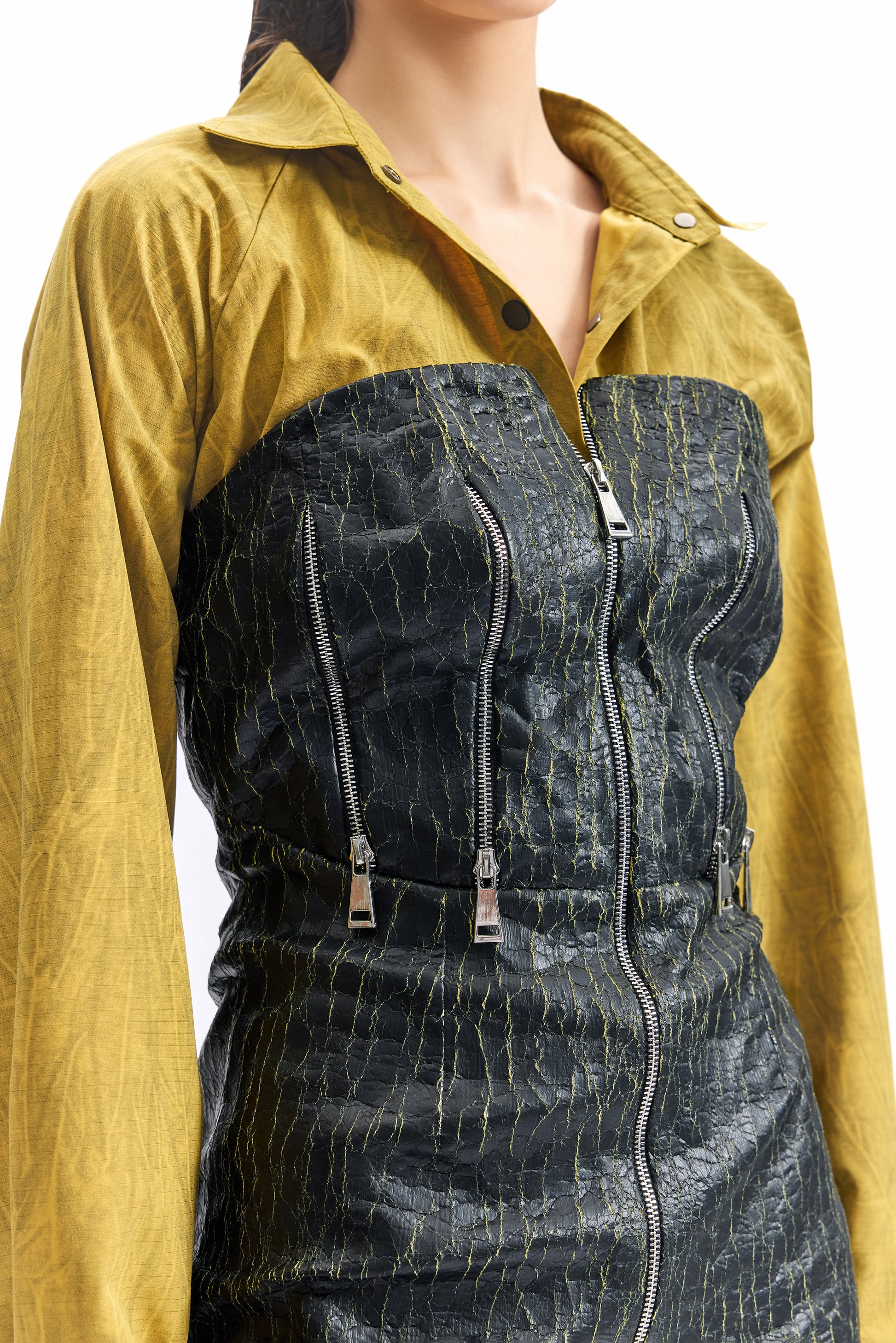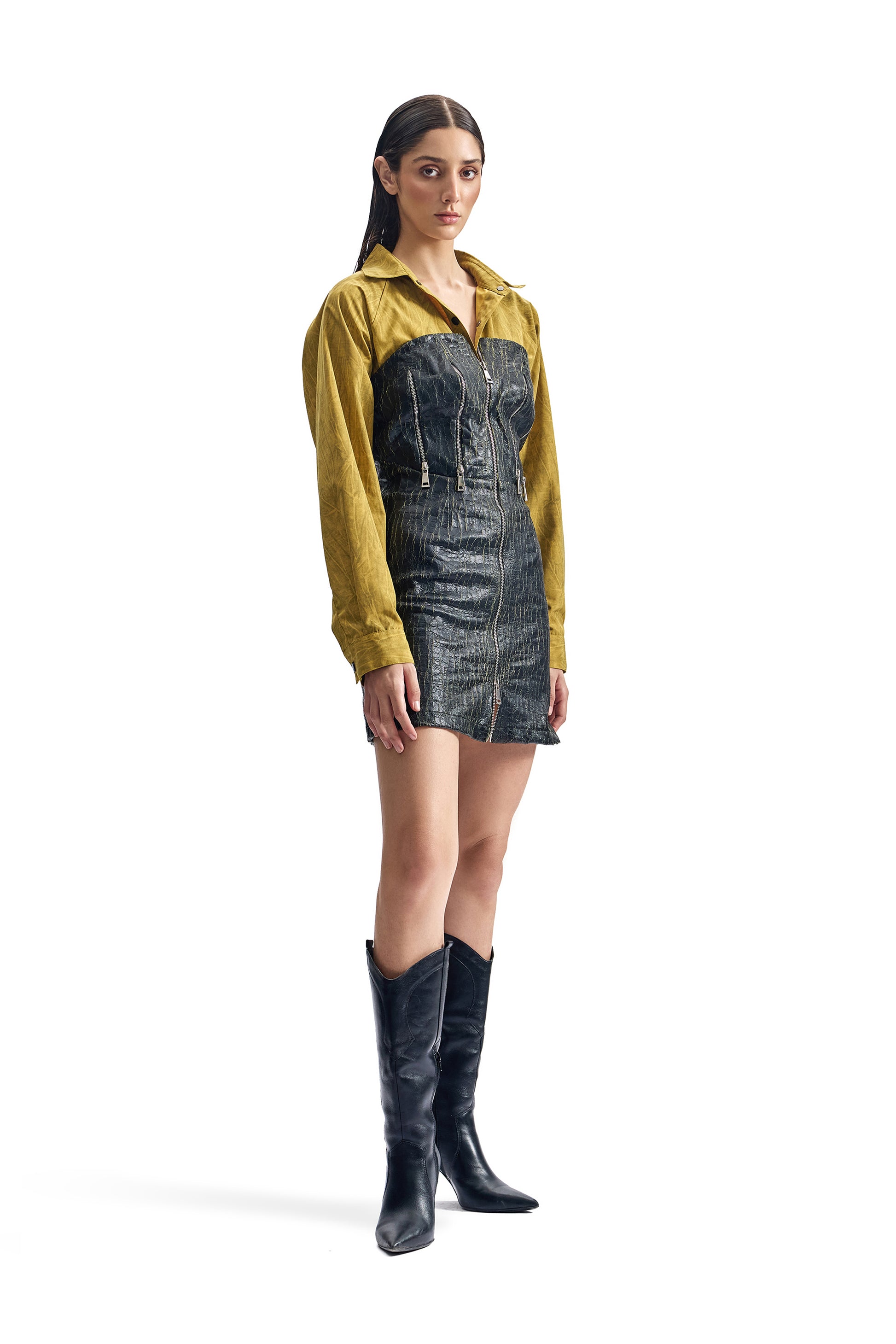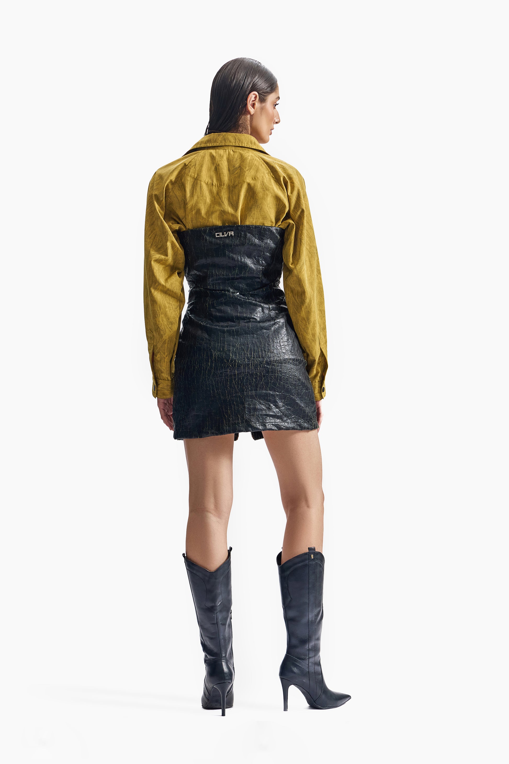 A hybrid mini dress fusing cracked leather with an structured shirt base. Engineered with zipped corset paneling, delivering a sharp contrast silhouette