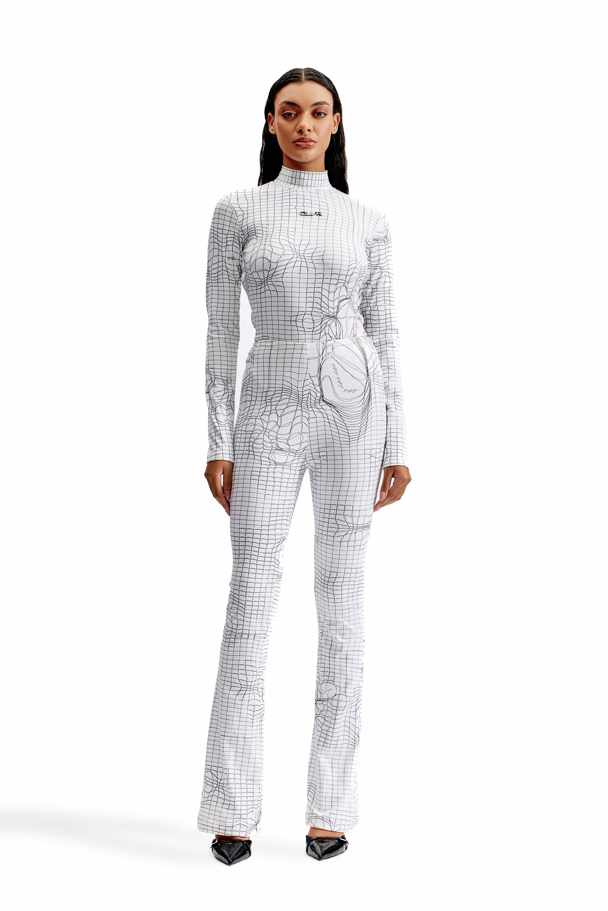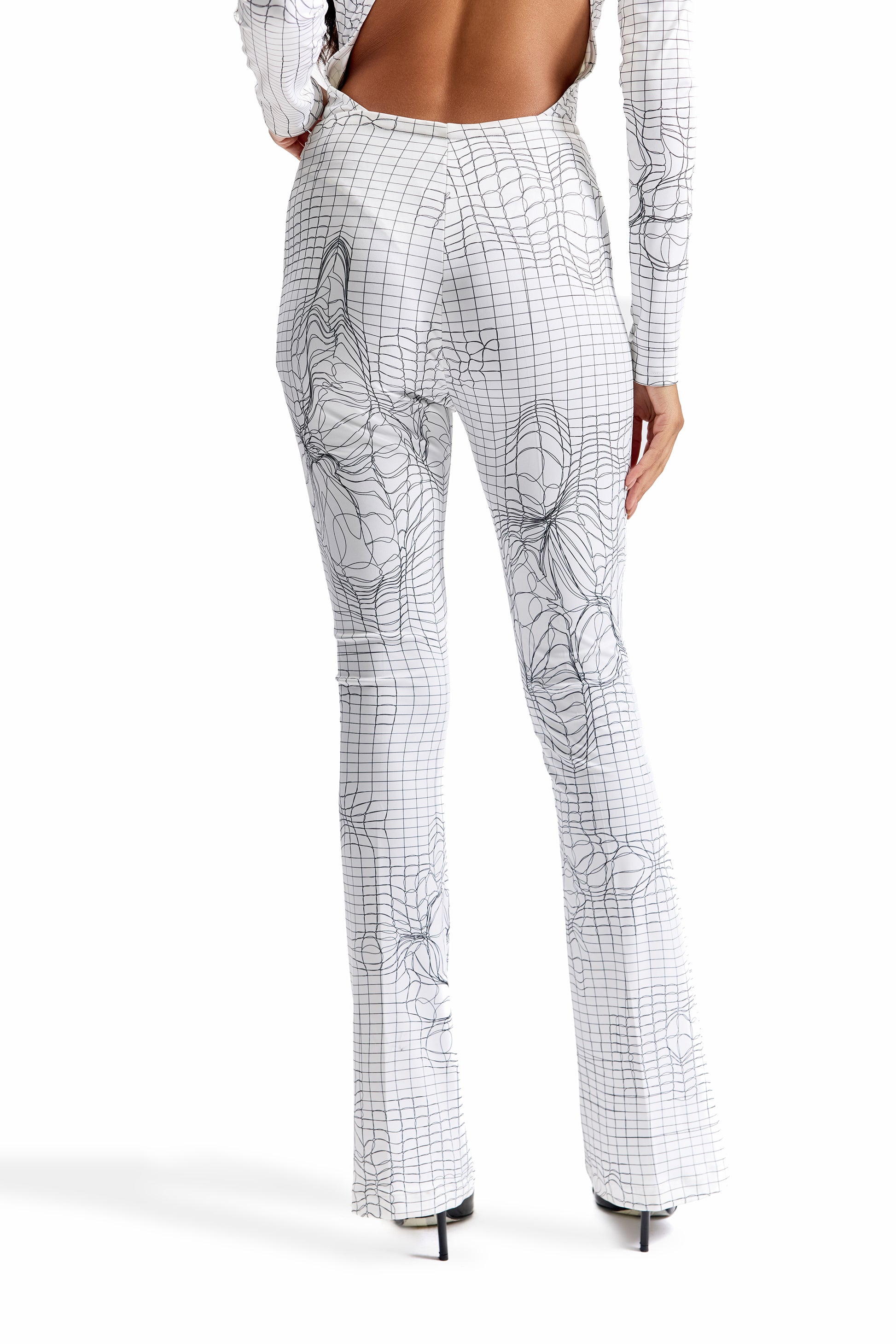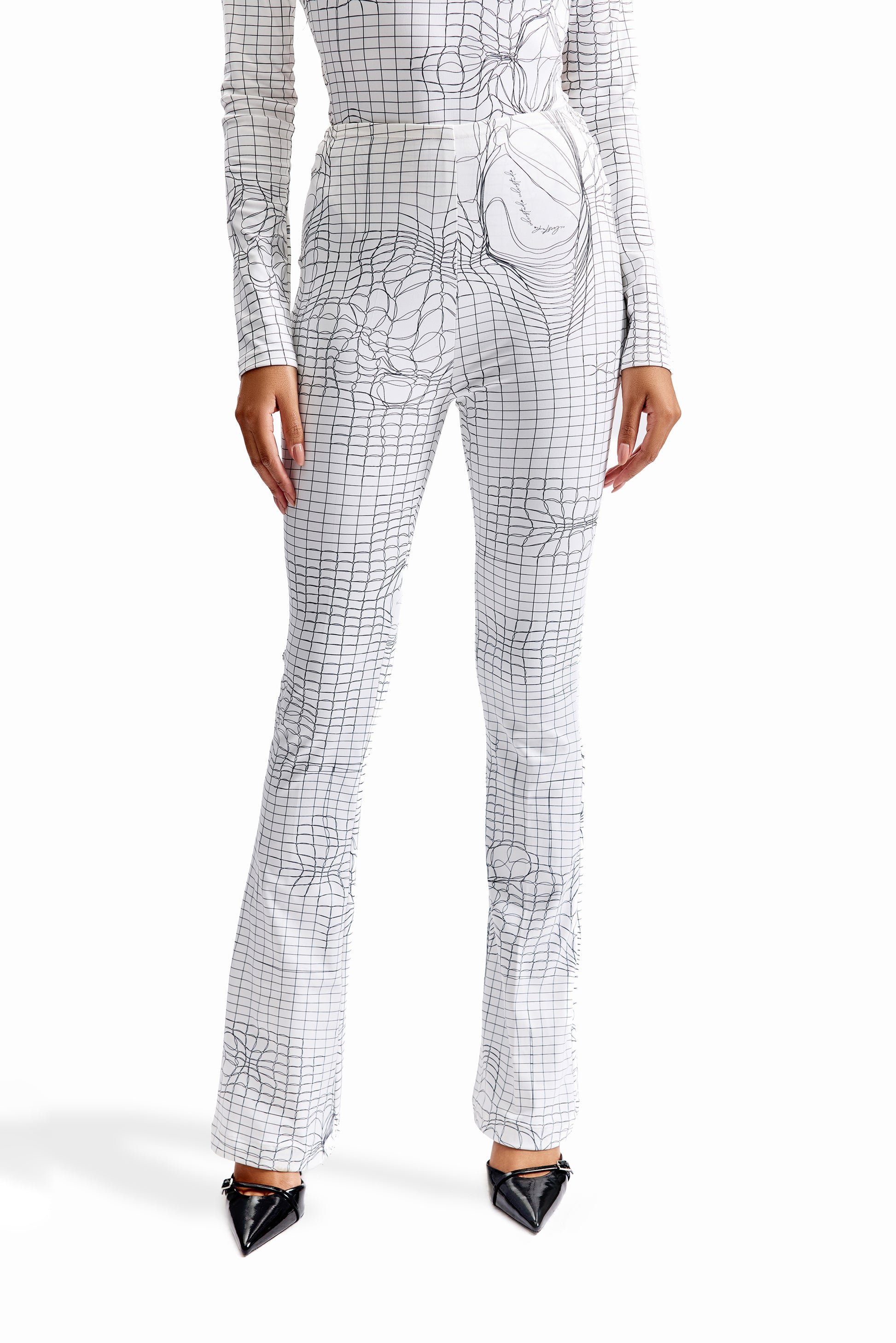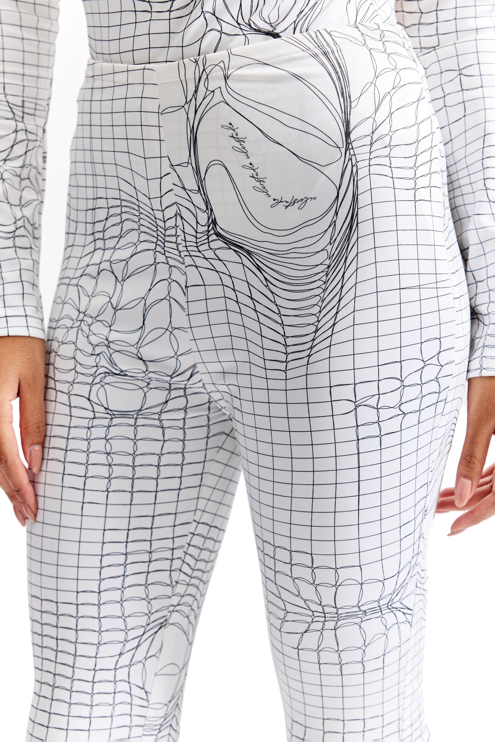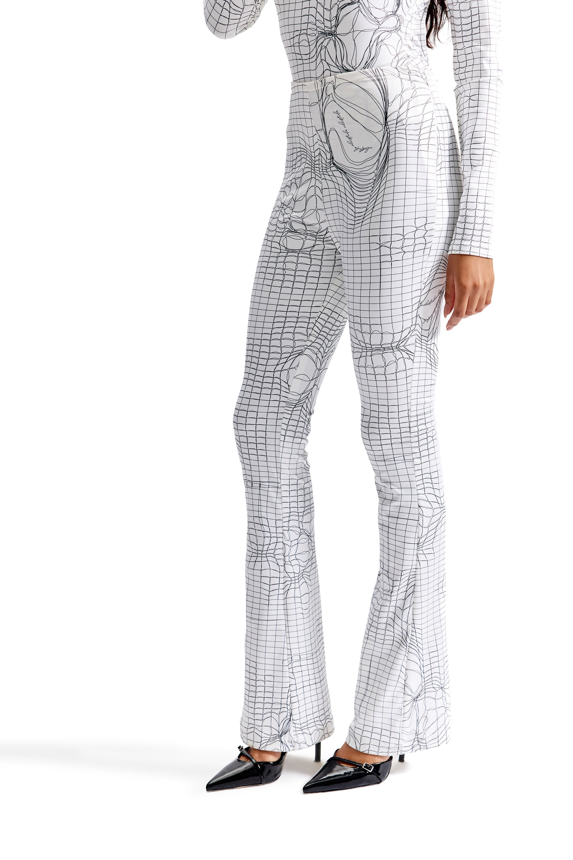 A high-waist flared pant crafted in CILVR’s signature Entangled Mesh print, designed to elongate the leg and balance structure with movement.