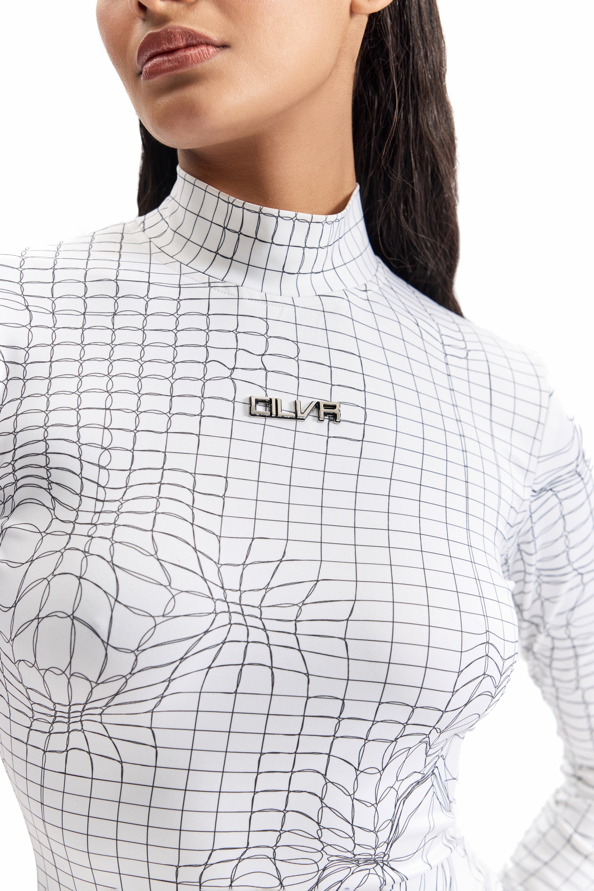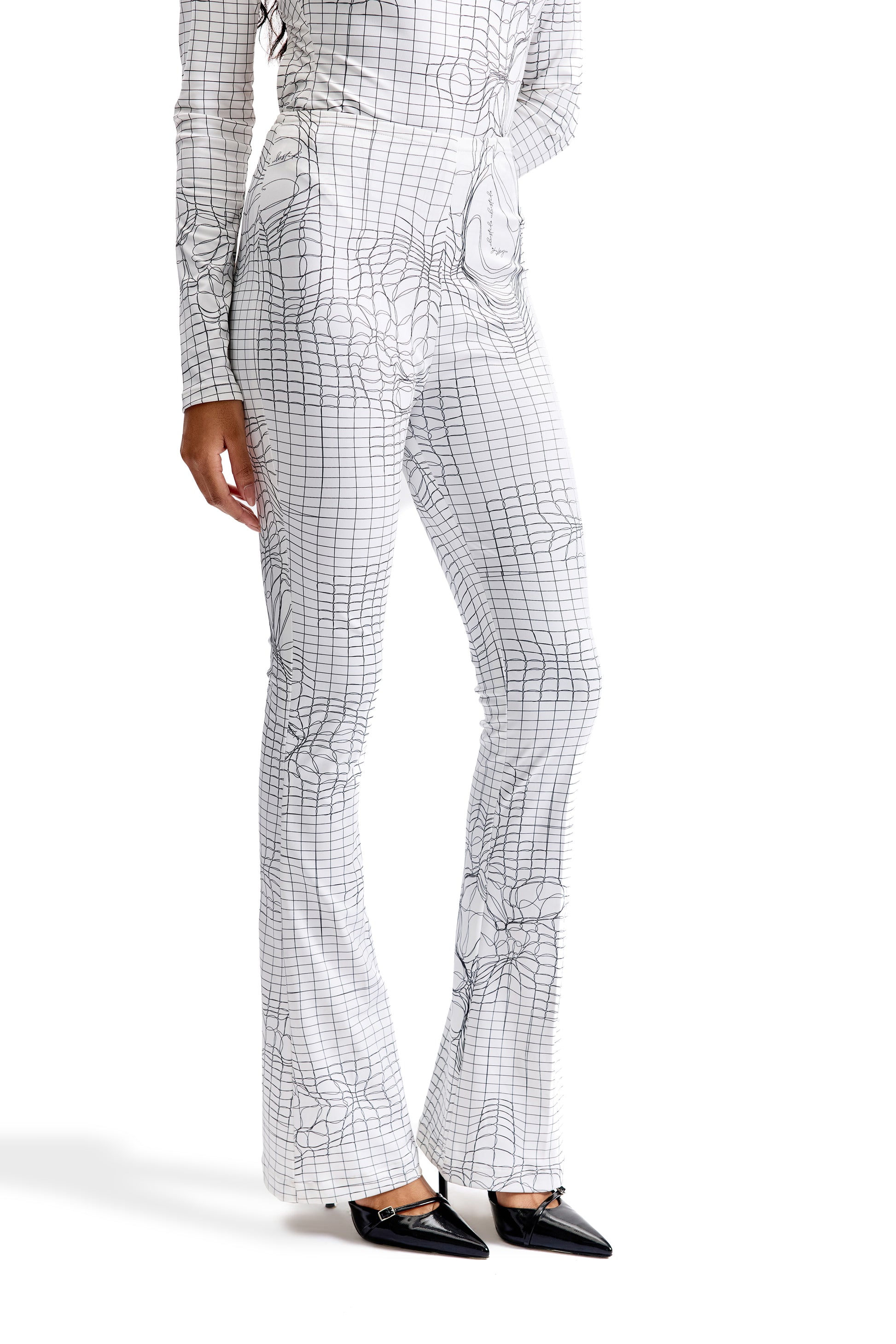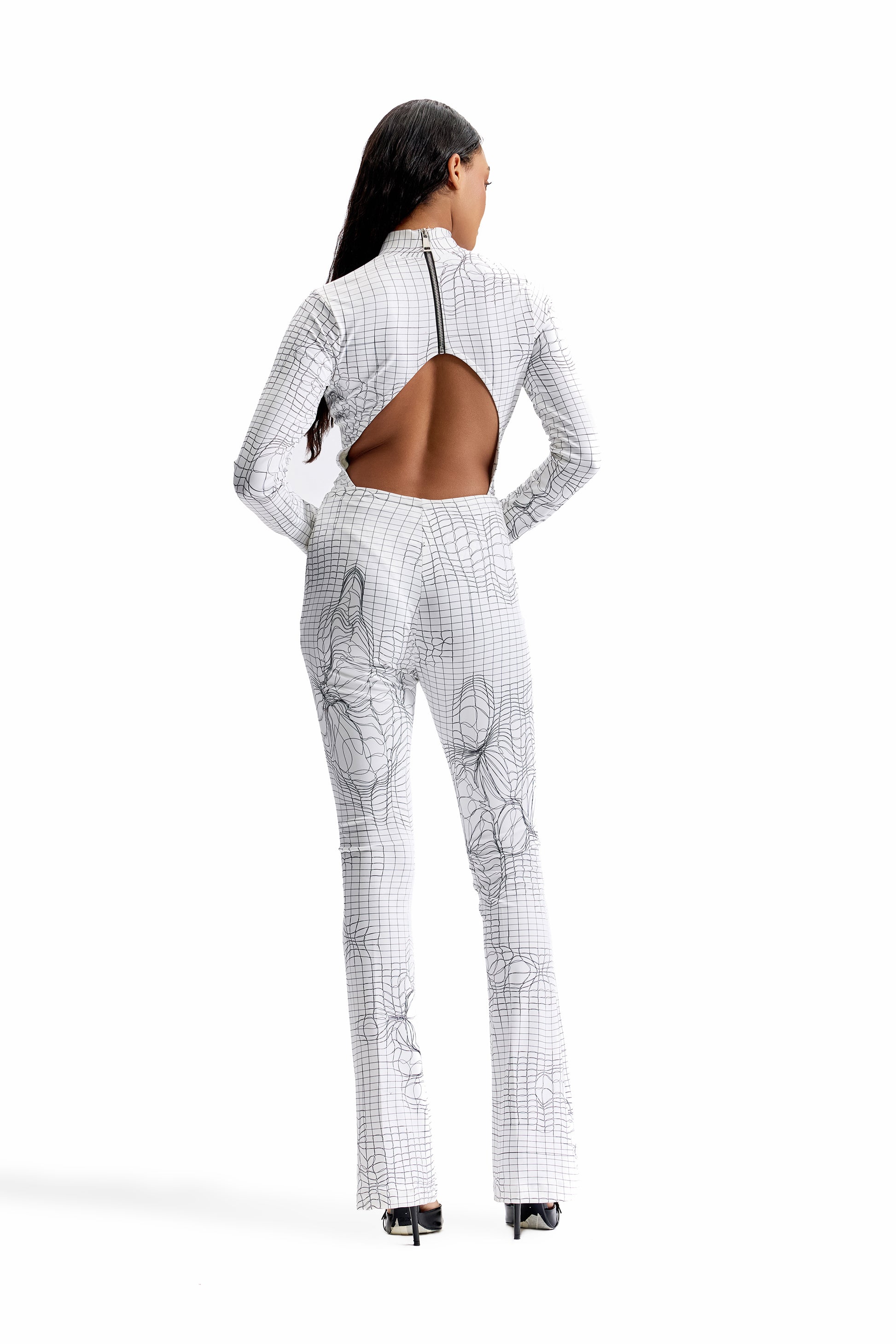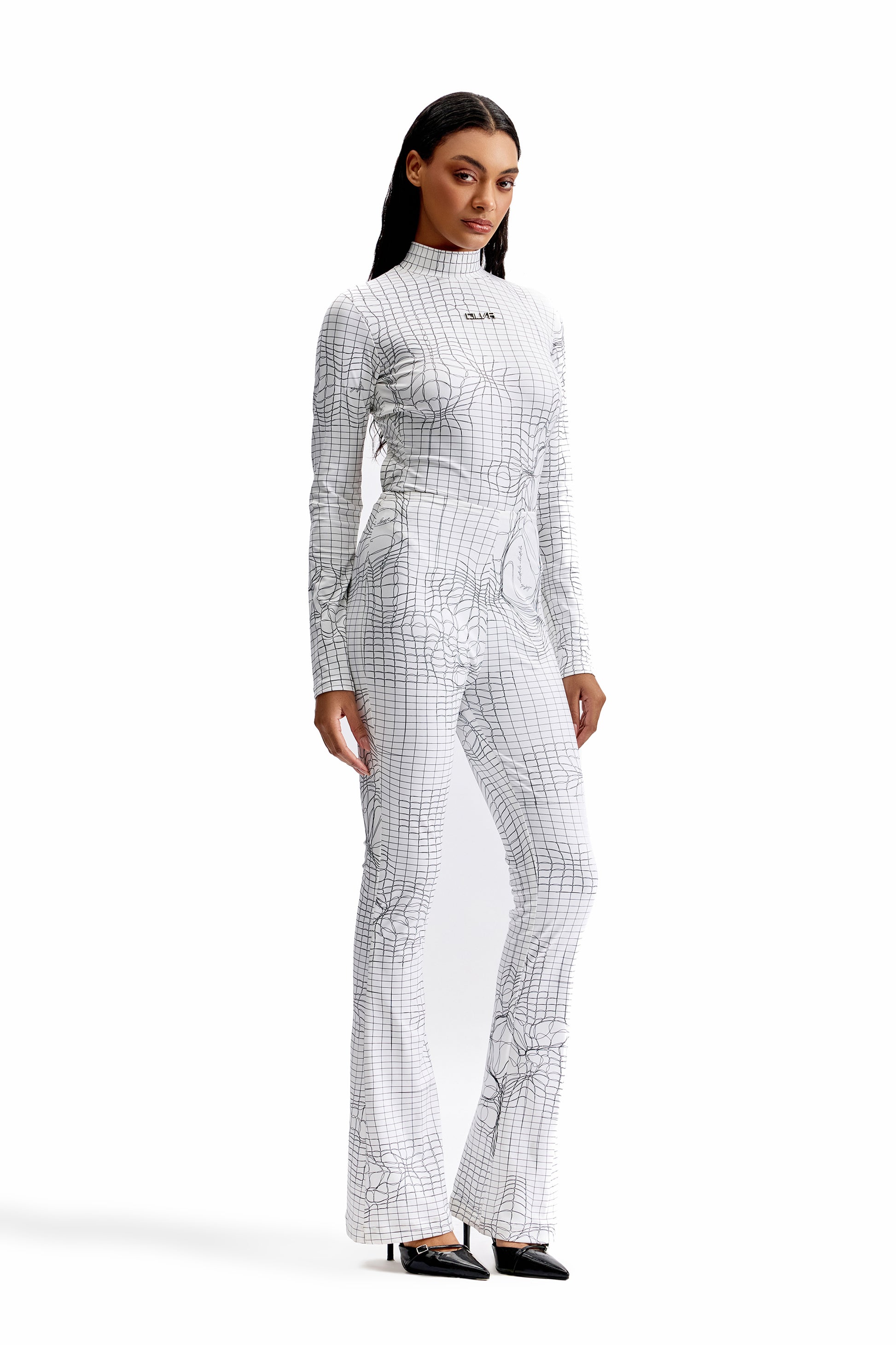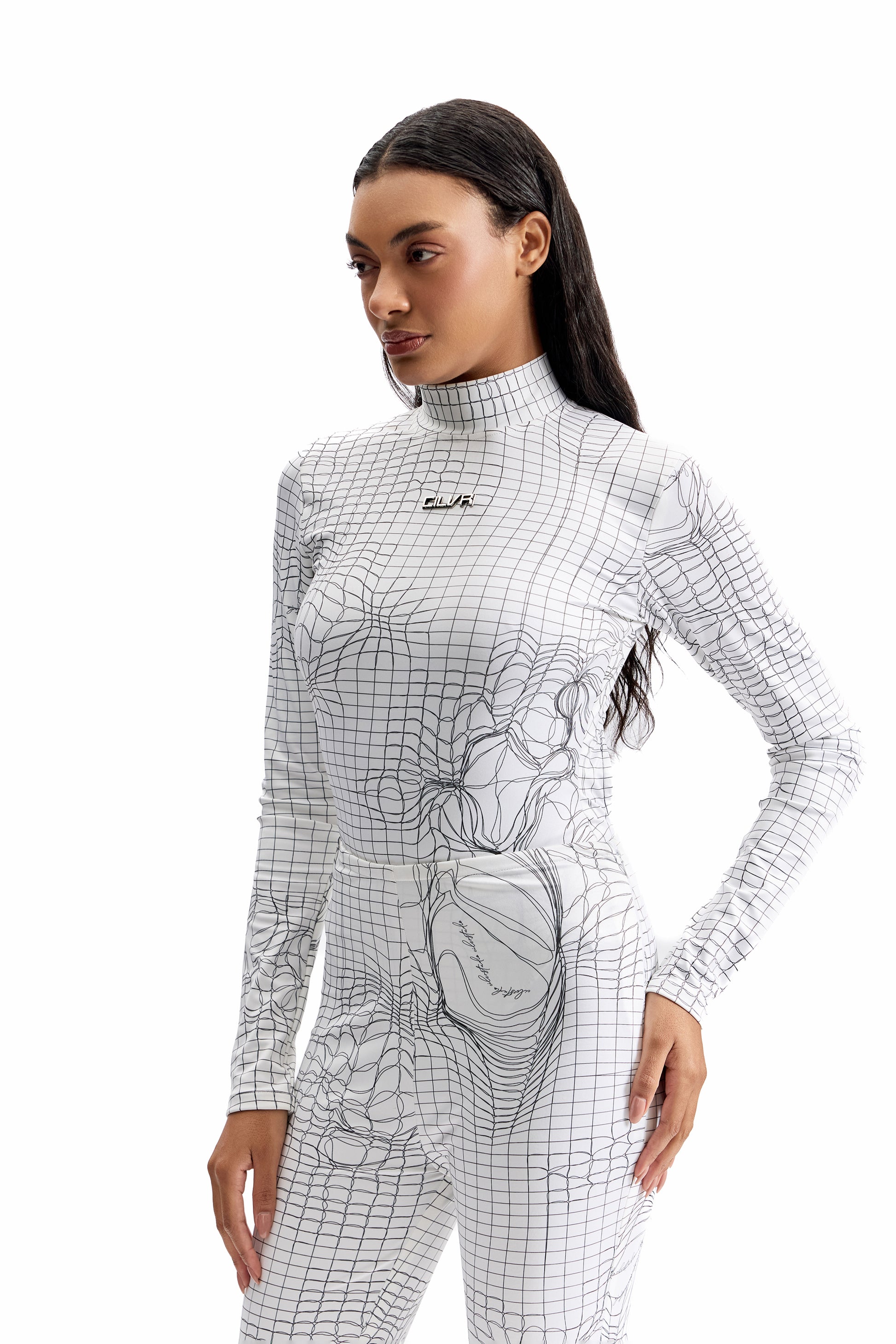 A two-piece ensemble engineered around CILVR’s signature Entangled Mesh print. This set pairs a sculpted, second-skin bodysuit with flared-fit pants, creating a silhouette that balances precision, movement, and graphic impact. Worn together, the look delivers a powerful, uninterrupted visual flow—elongating the body while maintaining a sharp, futuristic edge.