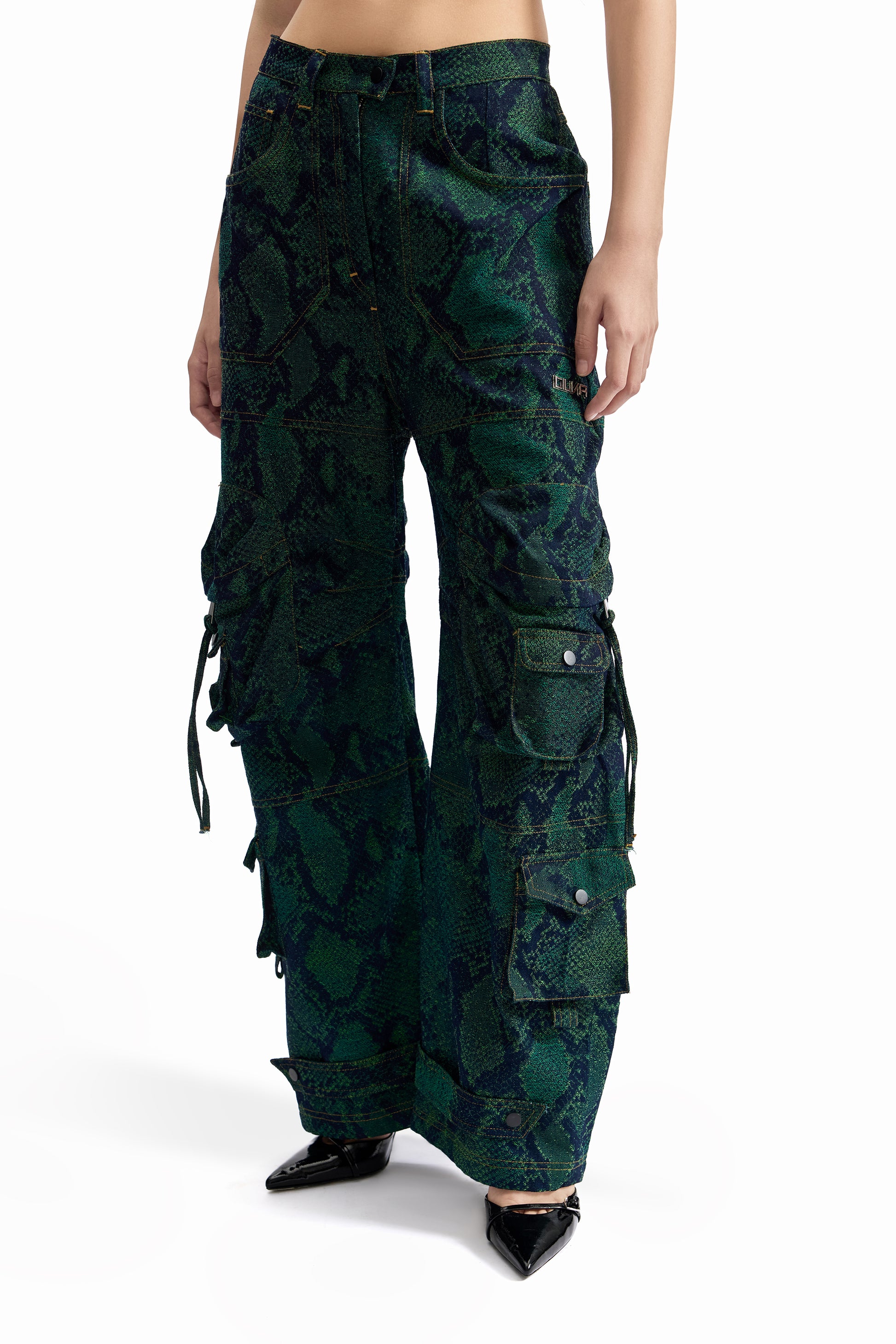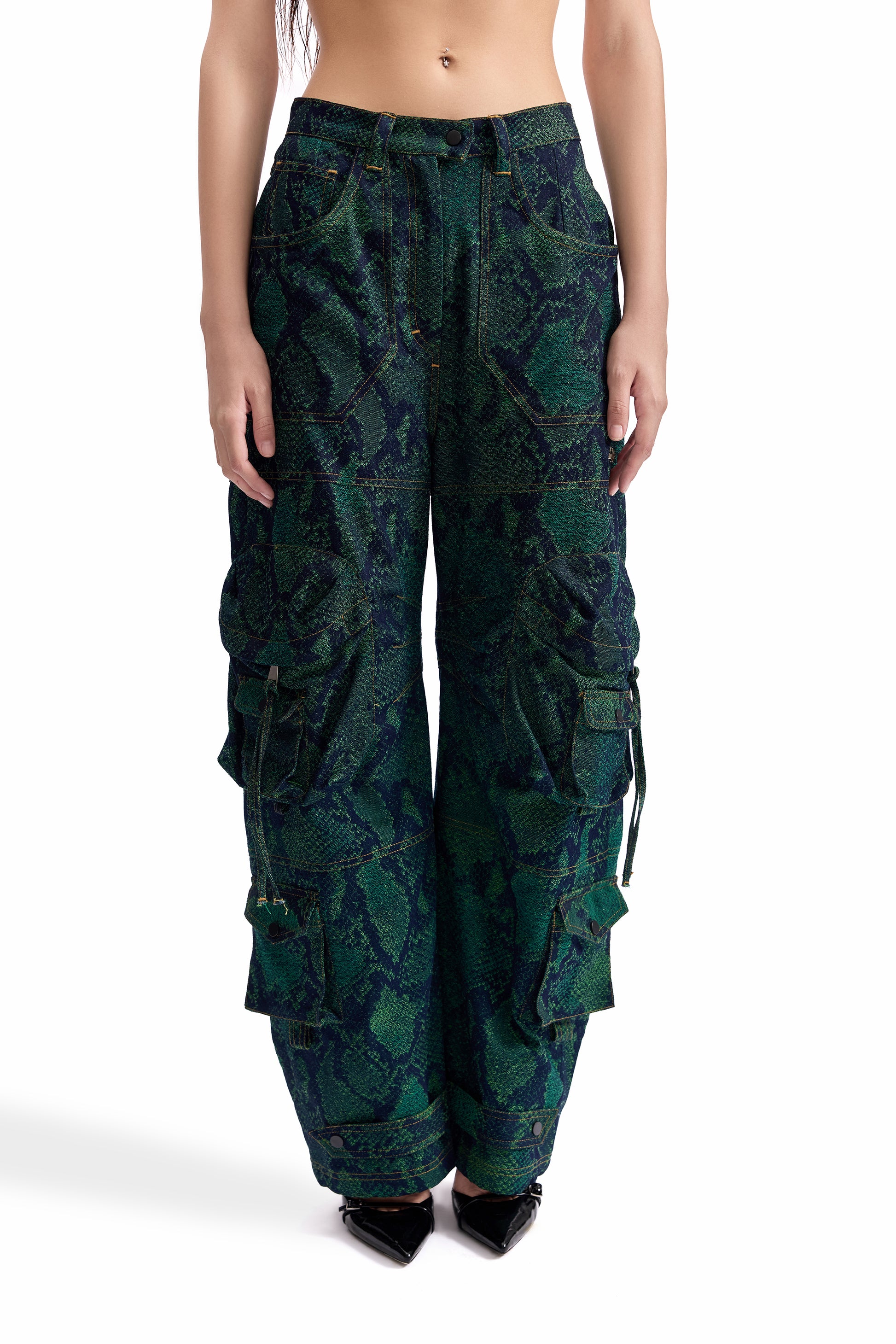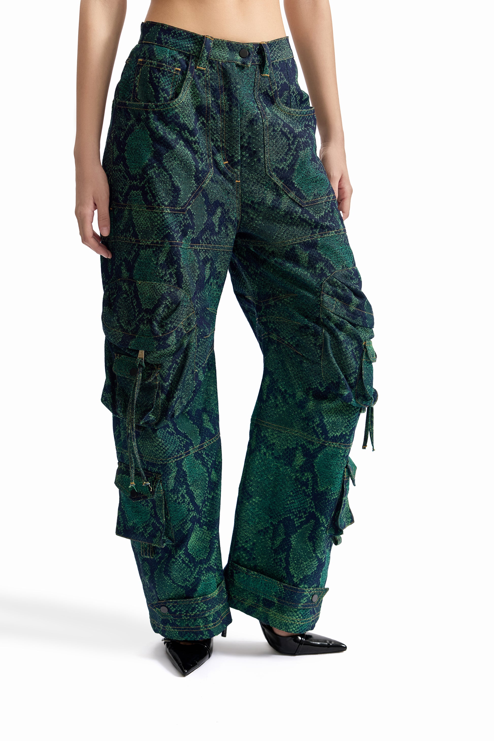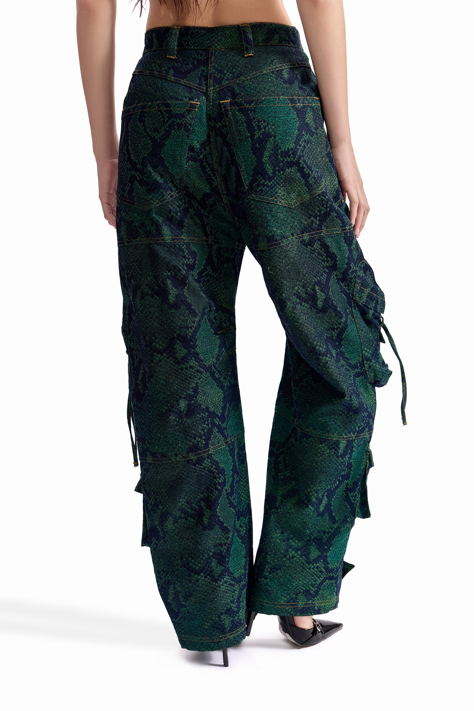 A relaxed-fit cargo pant crafted in snakeskin-pattern jacquard denim, merging tactile surface depth with utilitarian construction. Designed for movement and durability.