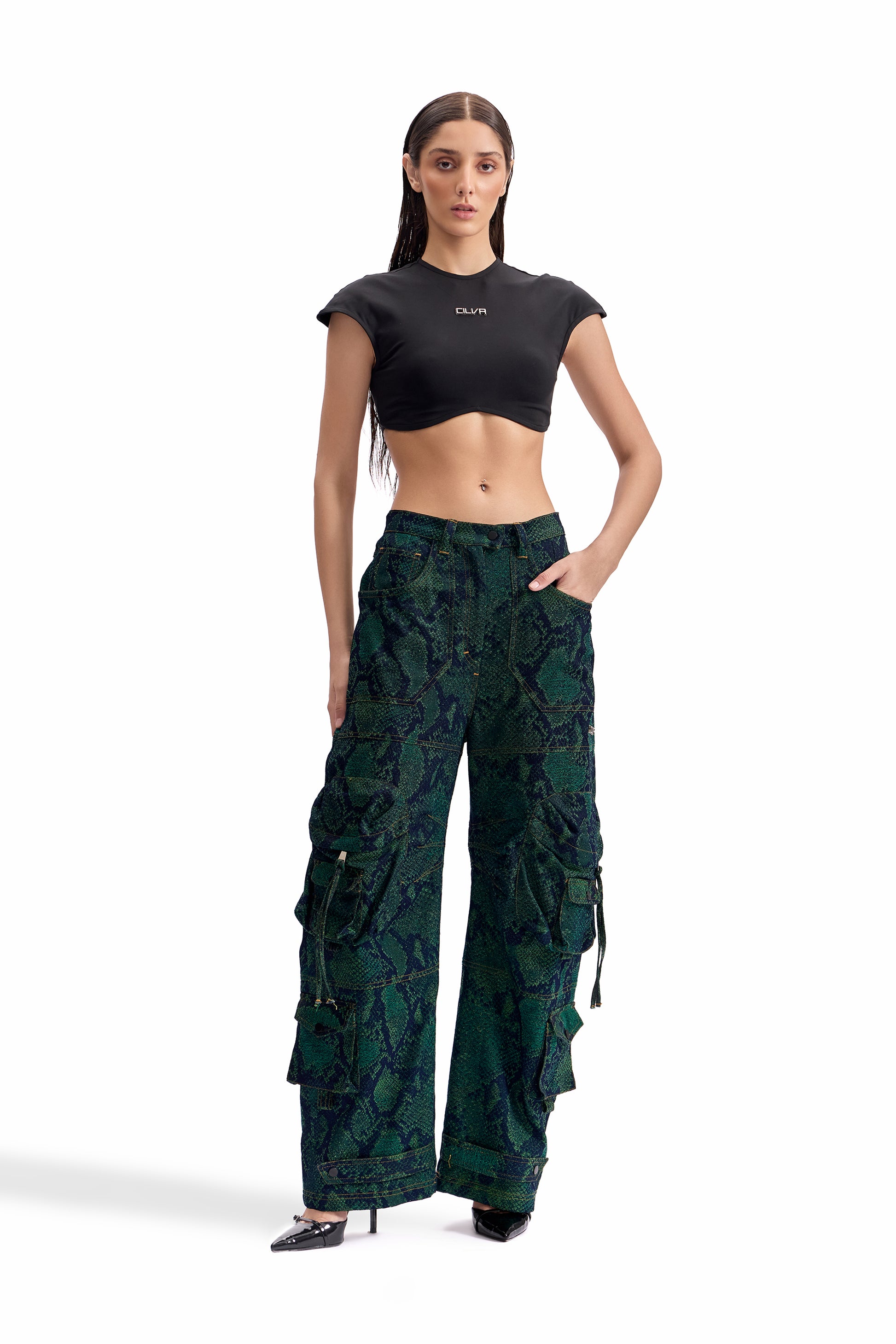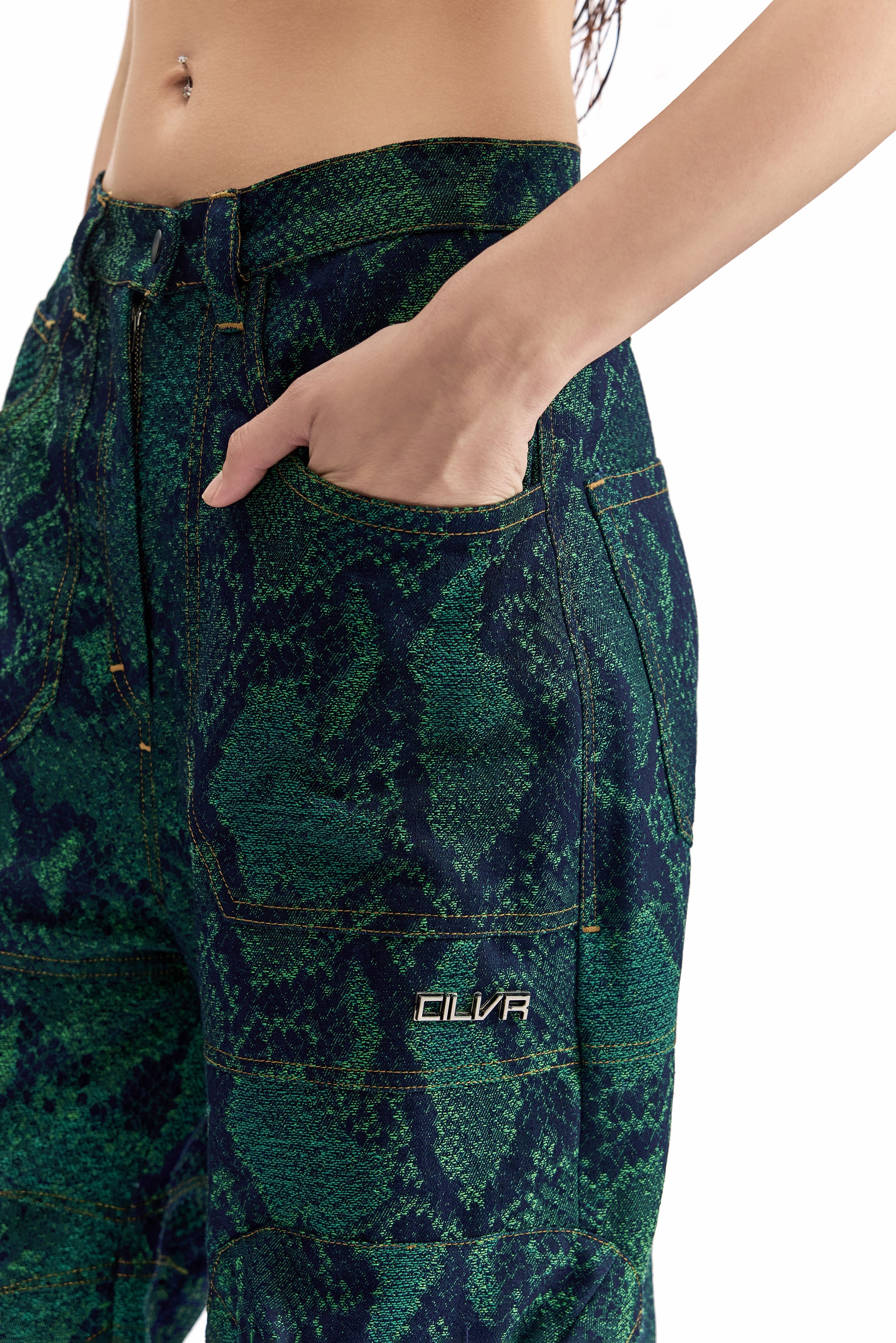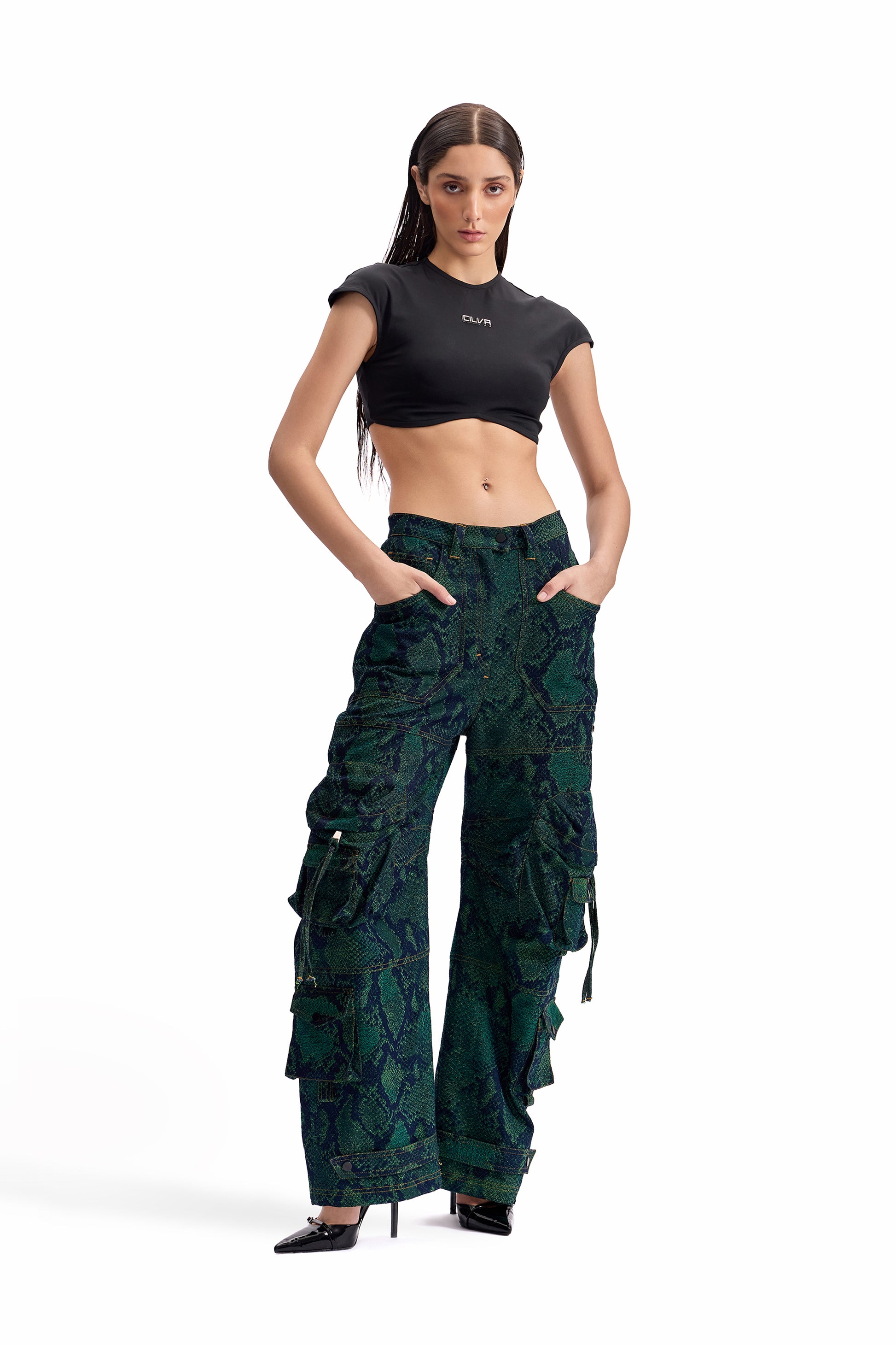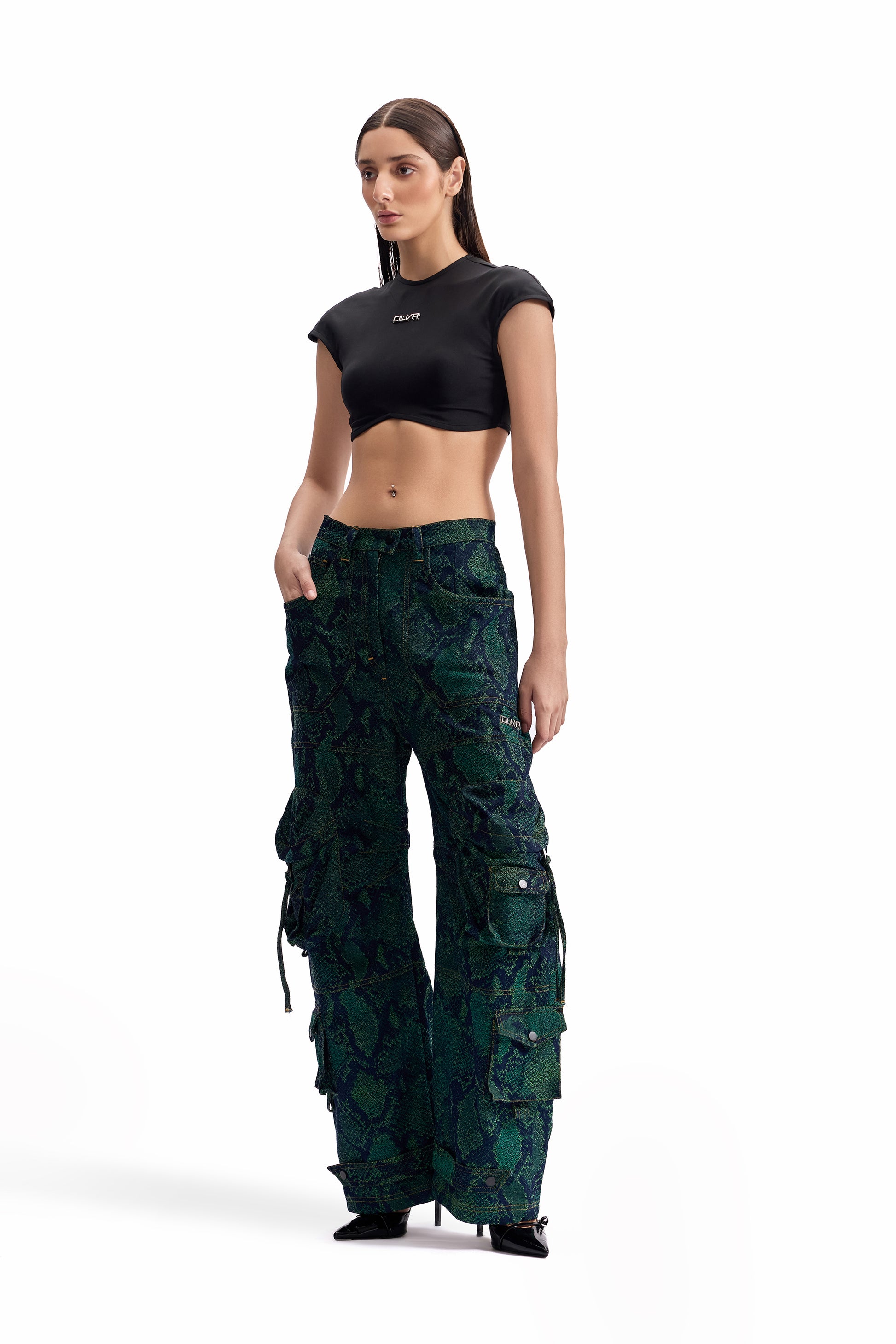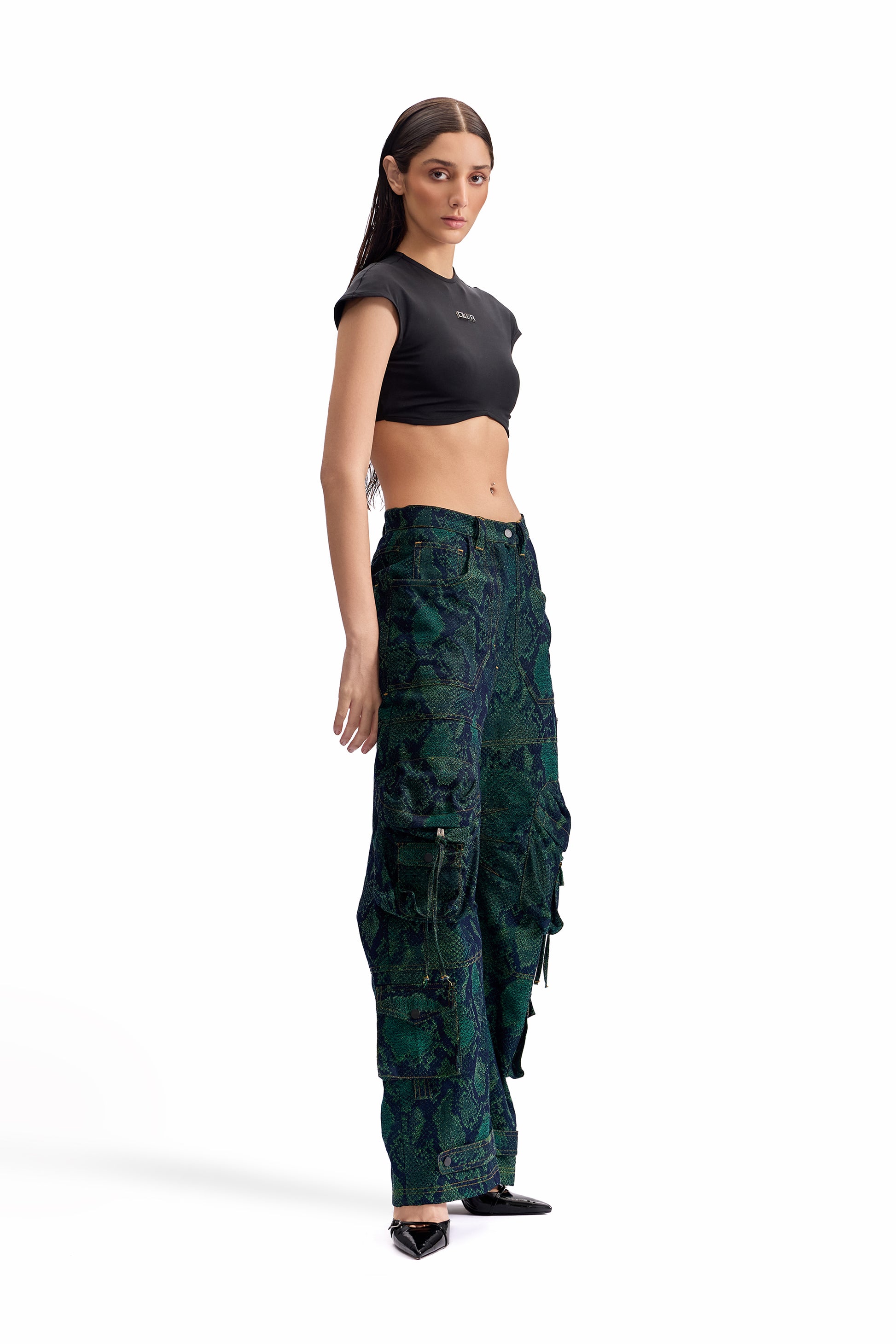 A relaxed-fit cargo pant crafted in snakeskin-pattern jacquard denim, merging tactile surface depth with utilitarian construction. Designed for movement and durability.