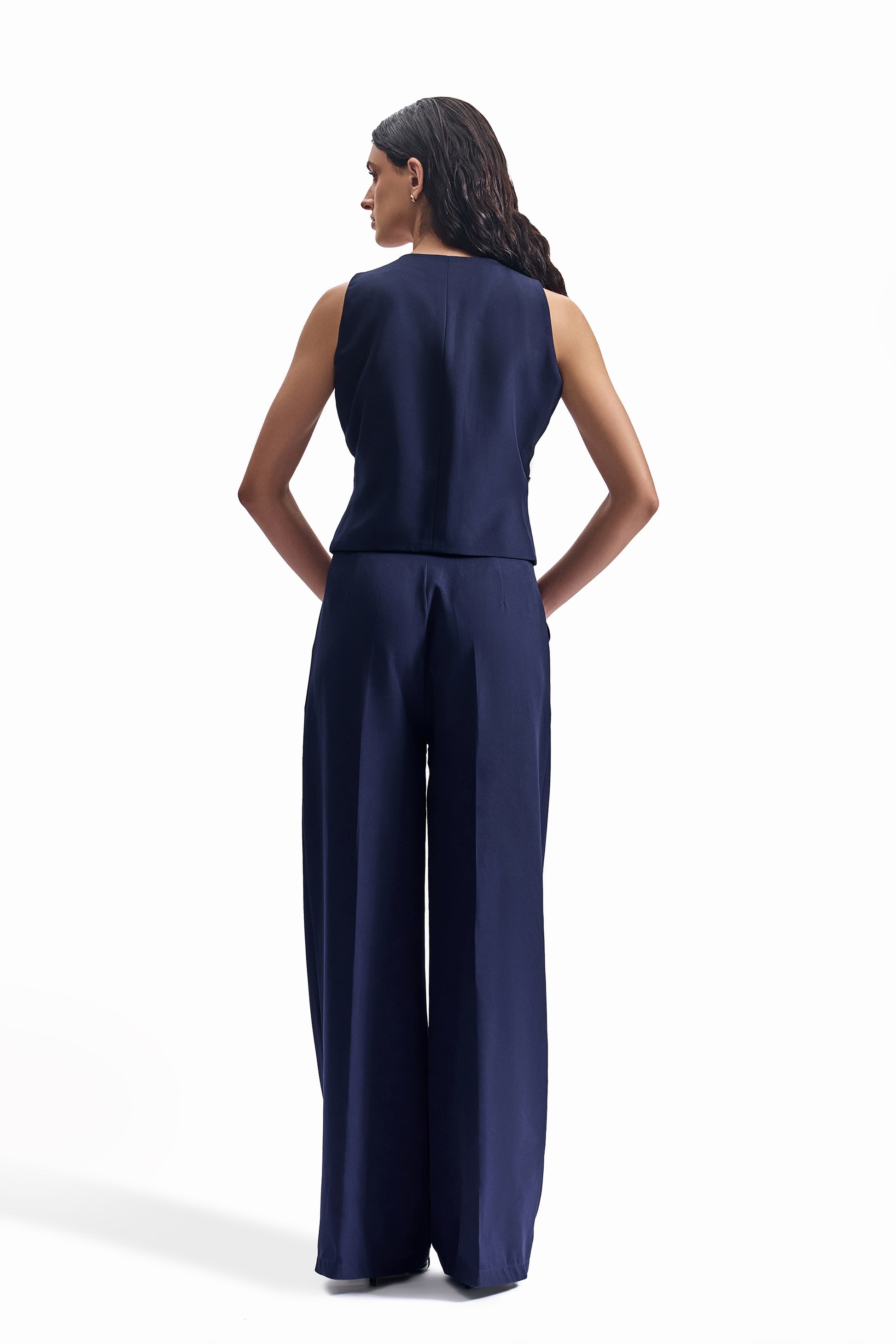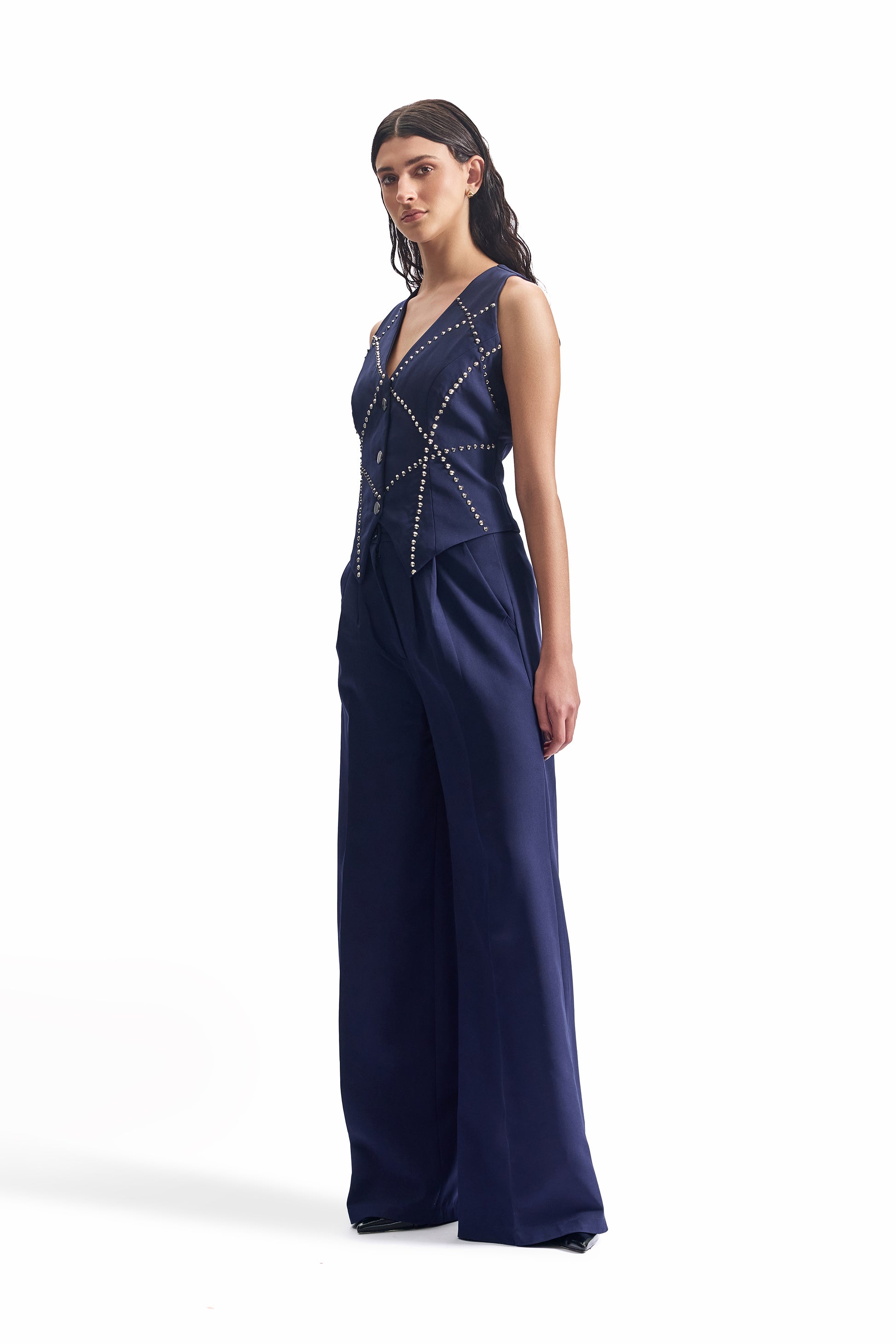 A sharply tailored waistcoat and trouser set, constructed in deep navy with metal-studded embroidery.