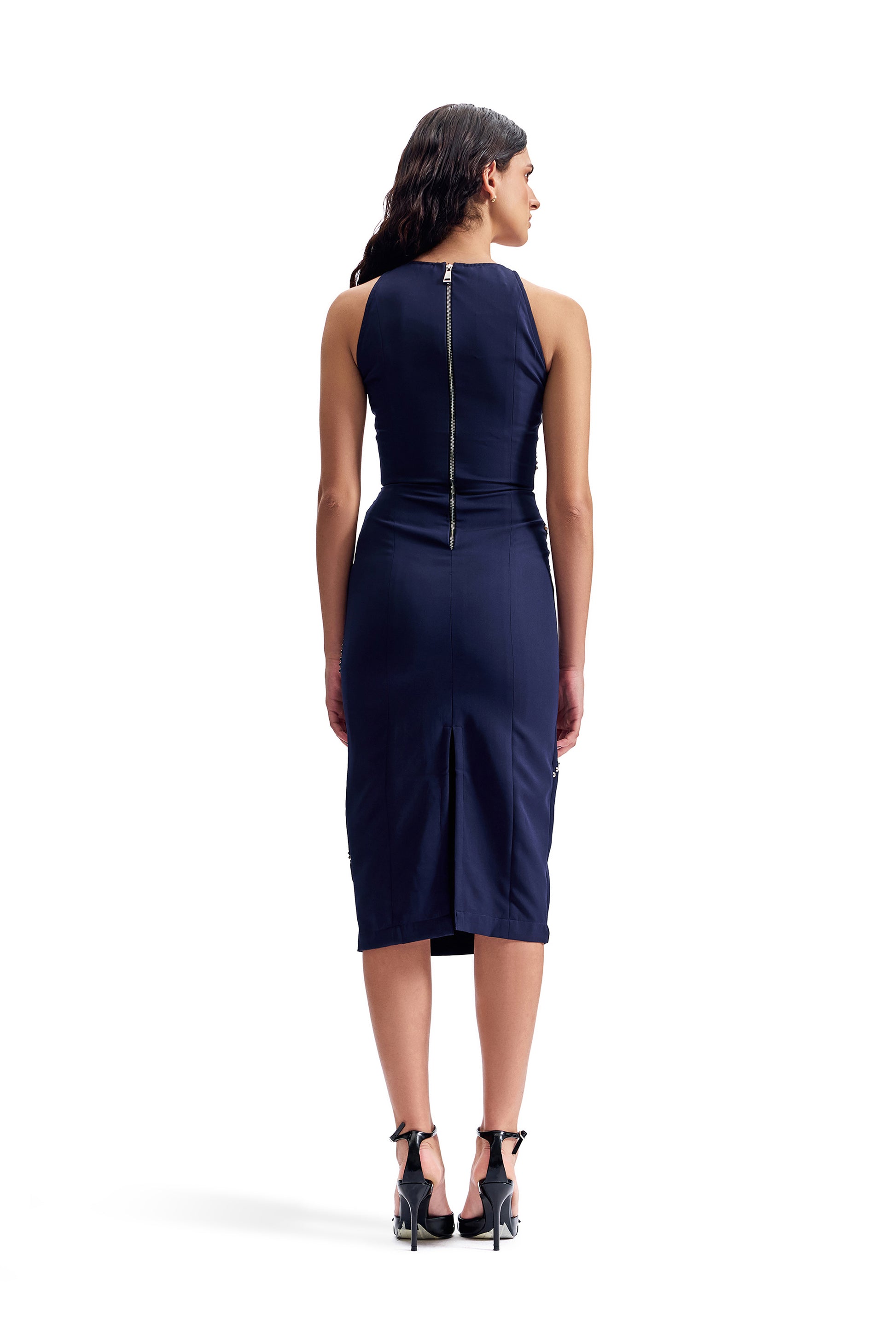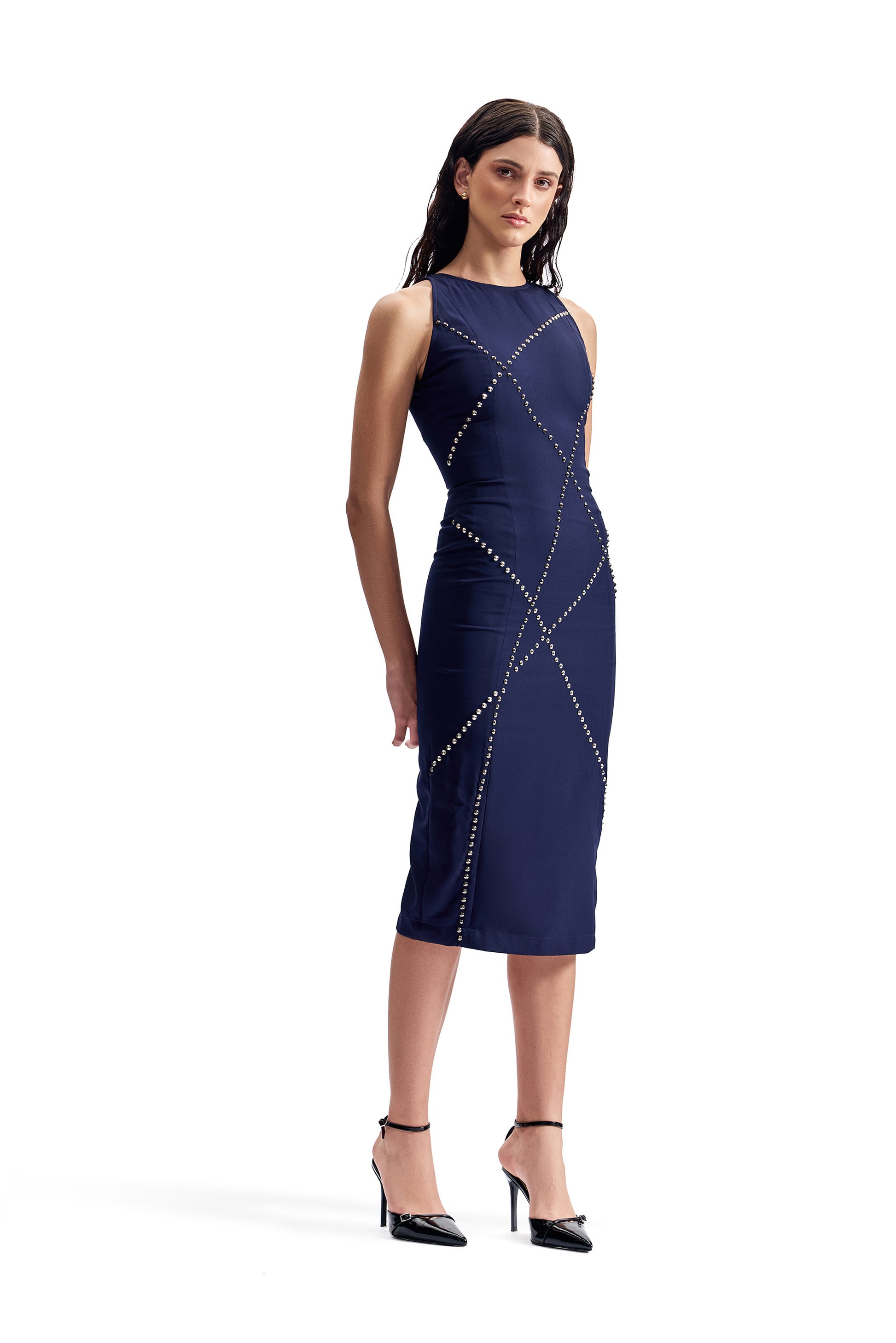 Dress engineered with sculpted tailoring and studded surface detailing, balancing strength and refinement.