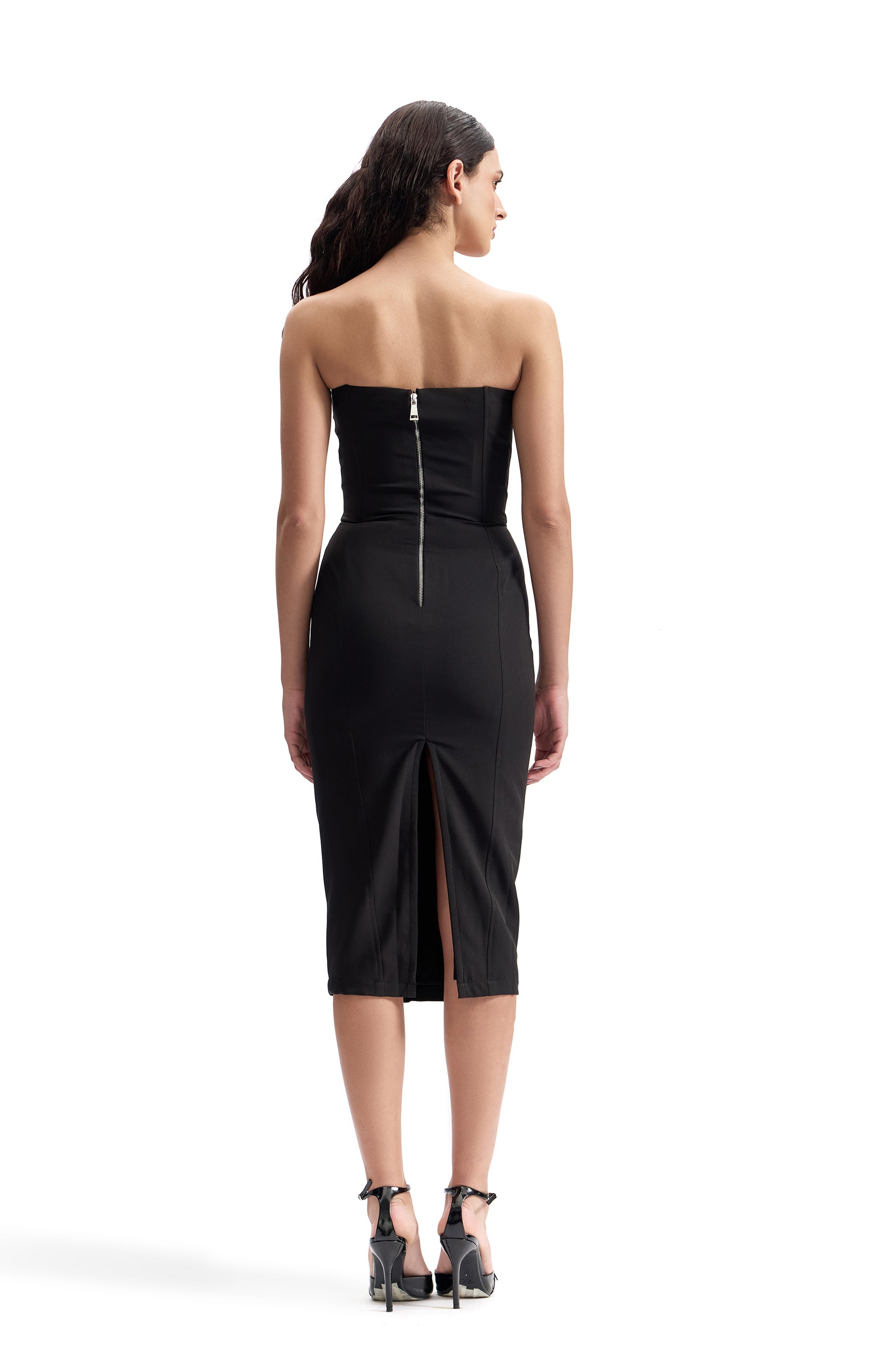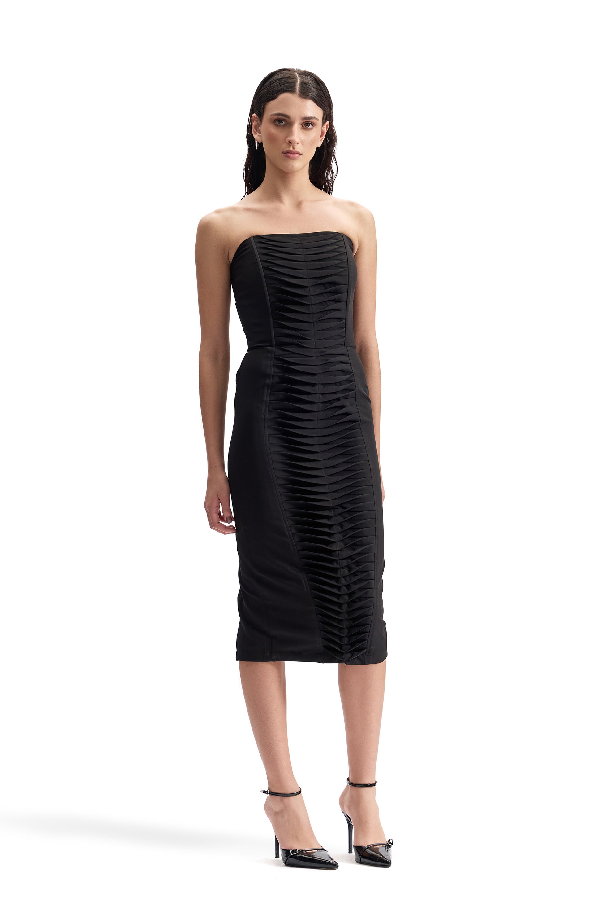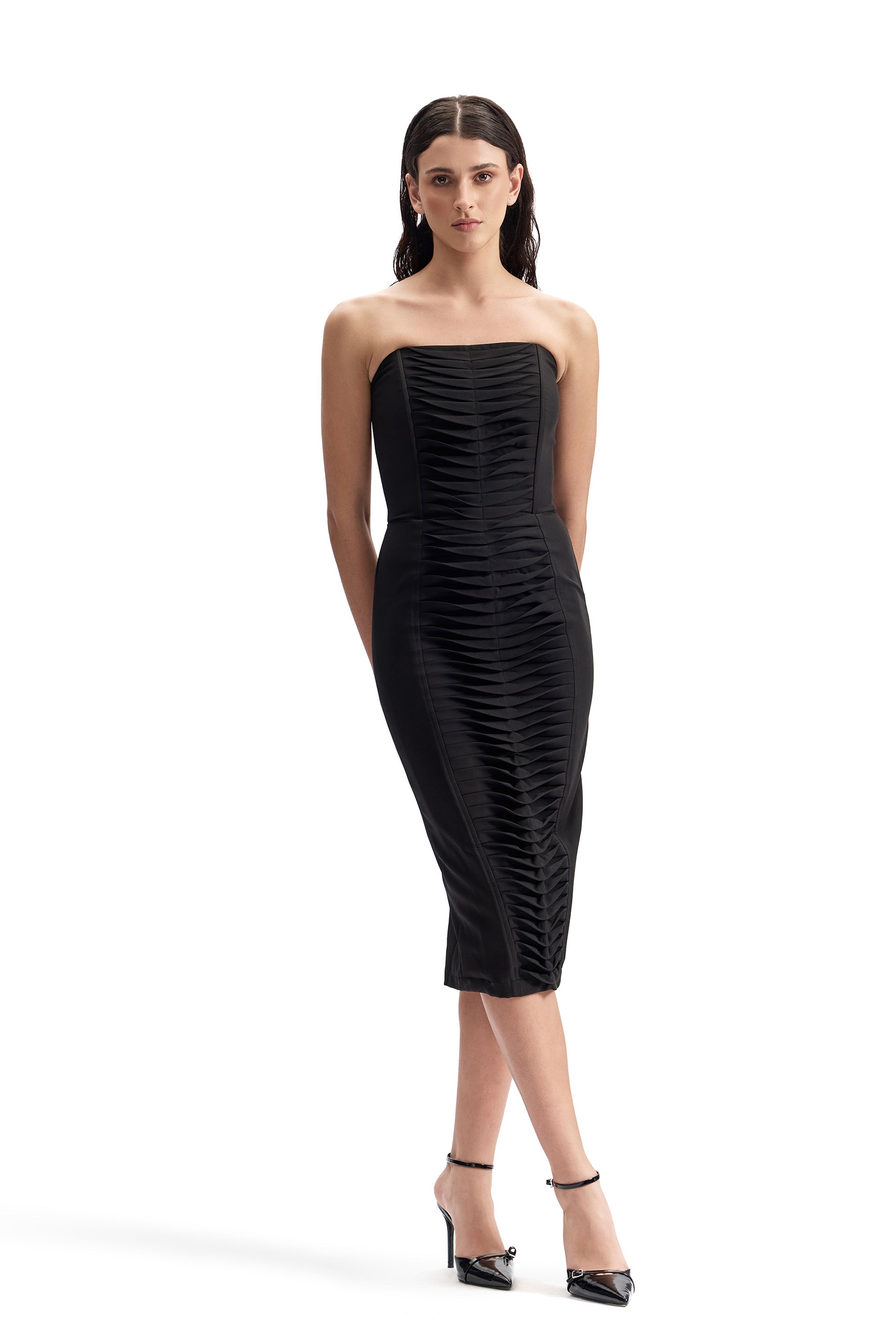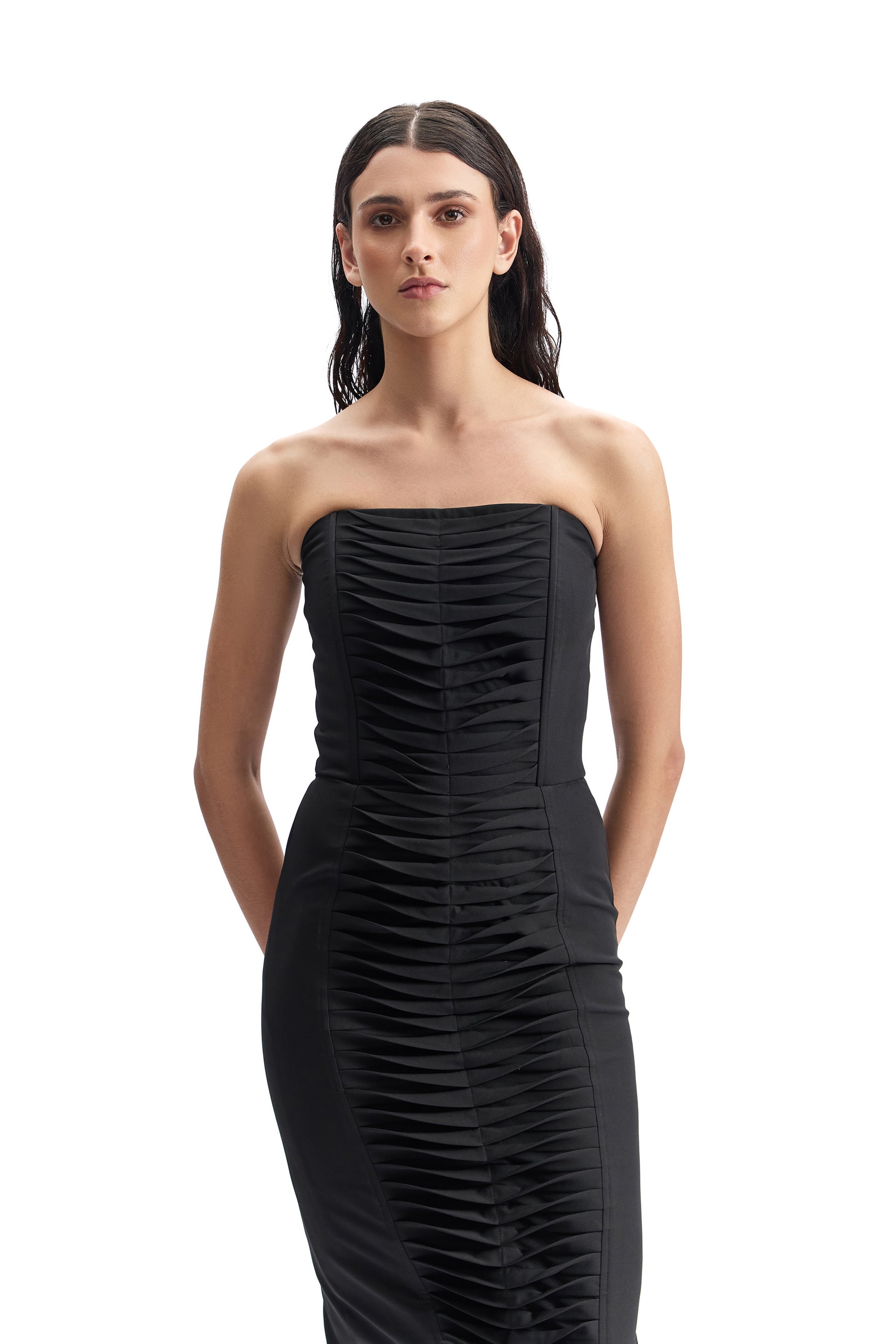 A sculpted strapless midi dress engineered to contour the body with architectural precision. Designed with sharp, symmetrical pleating through the center panel, this piece creates a strong vertical rhythm that enhances structure while elongating the silhouette.