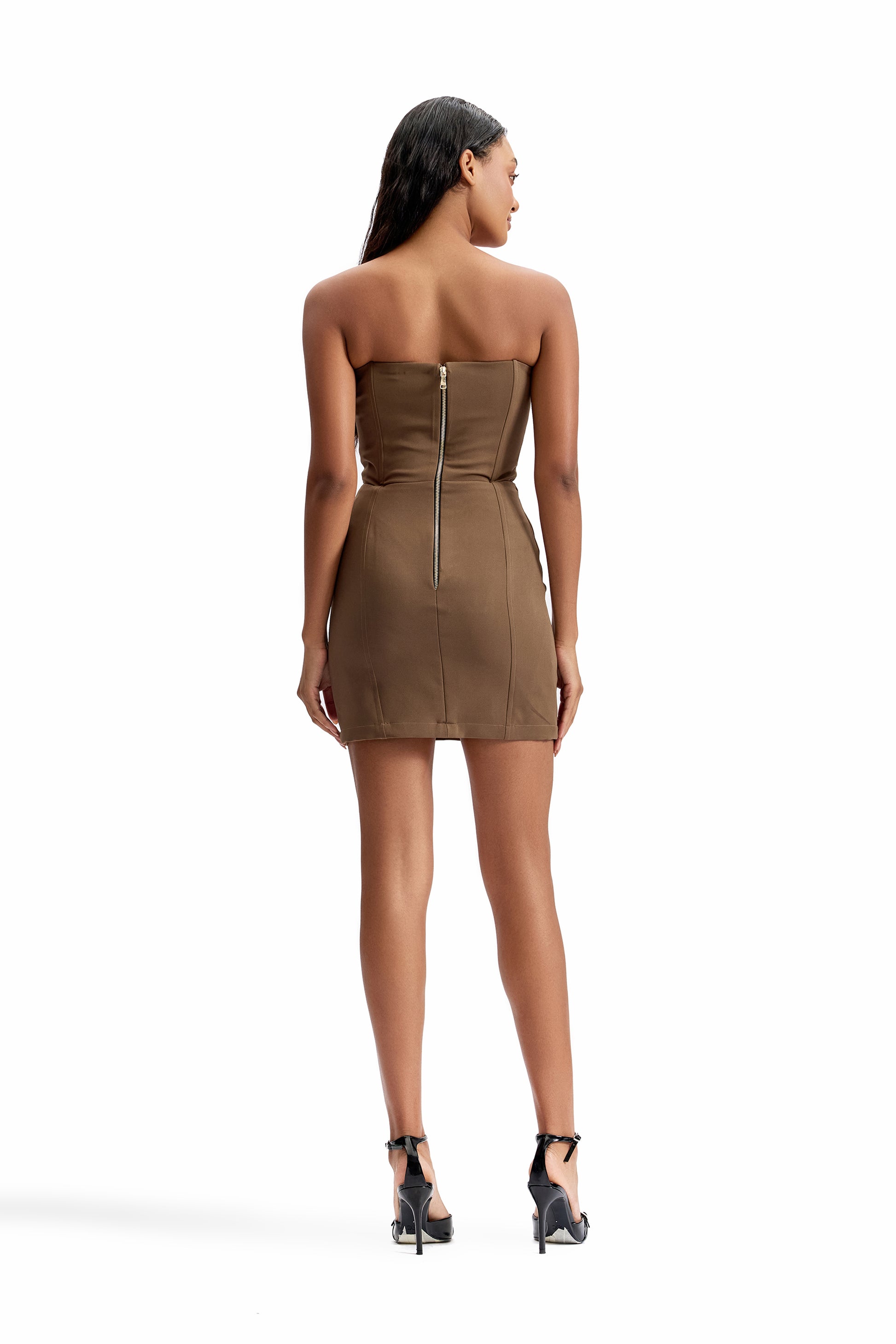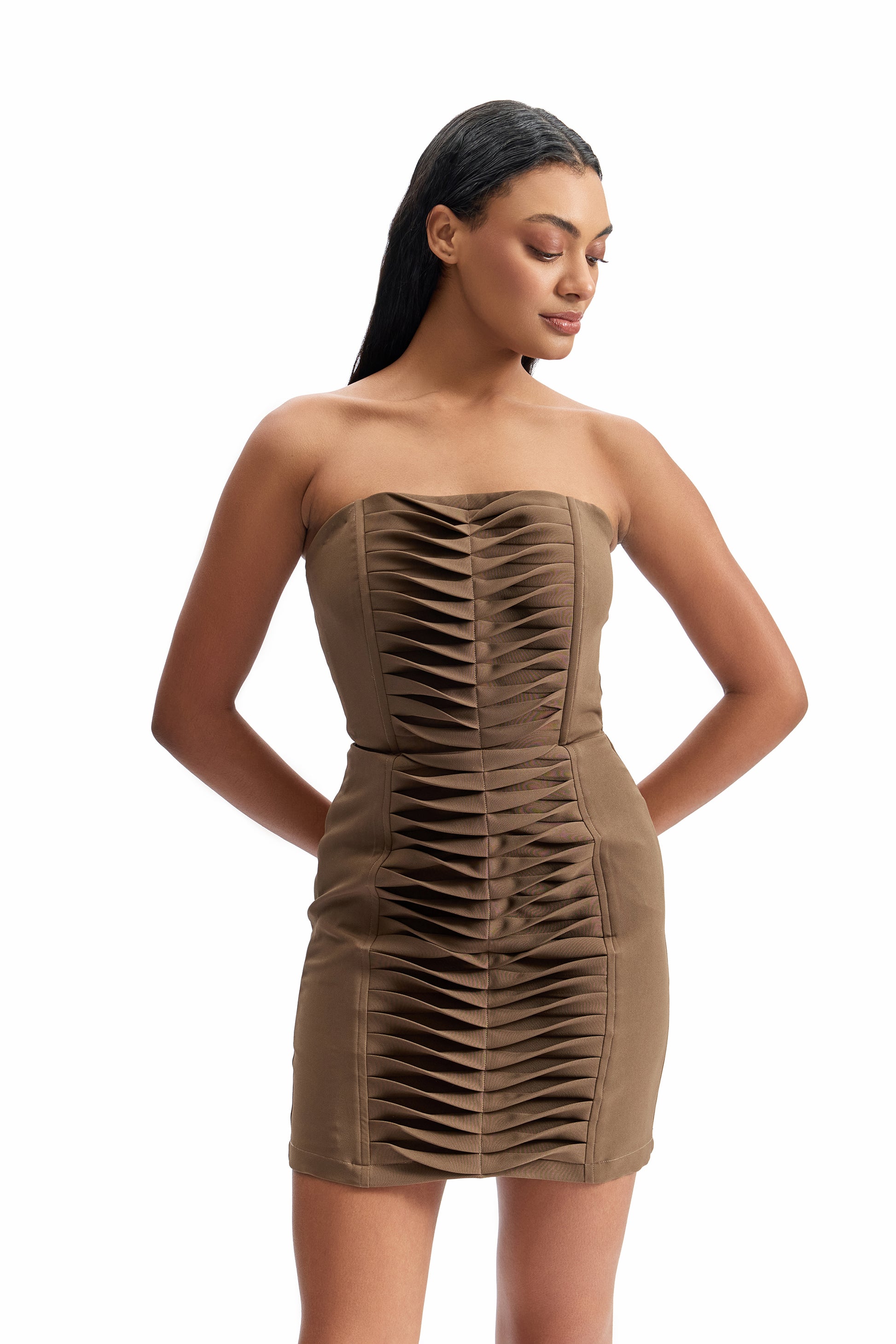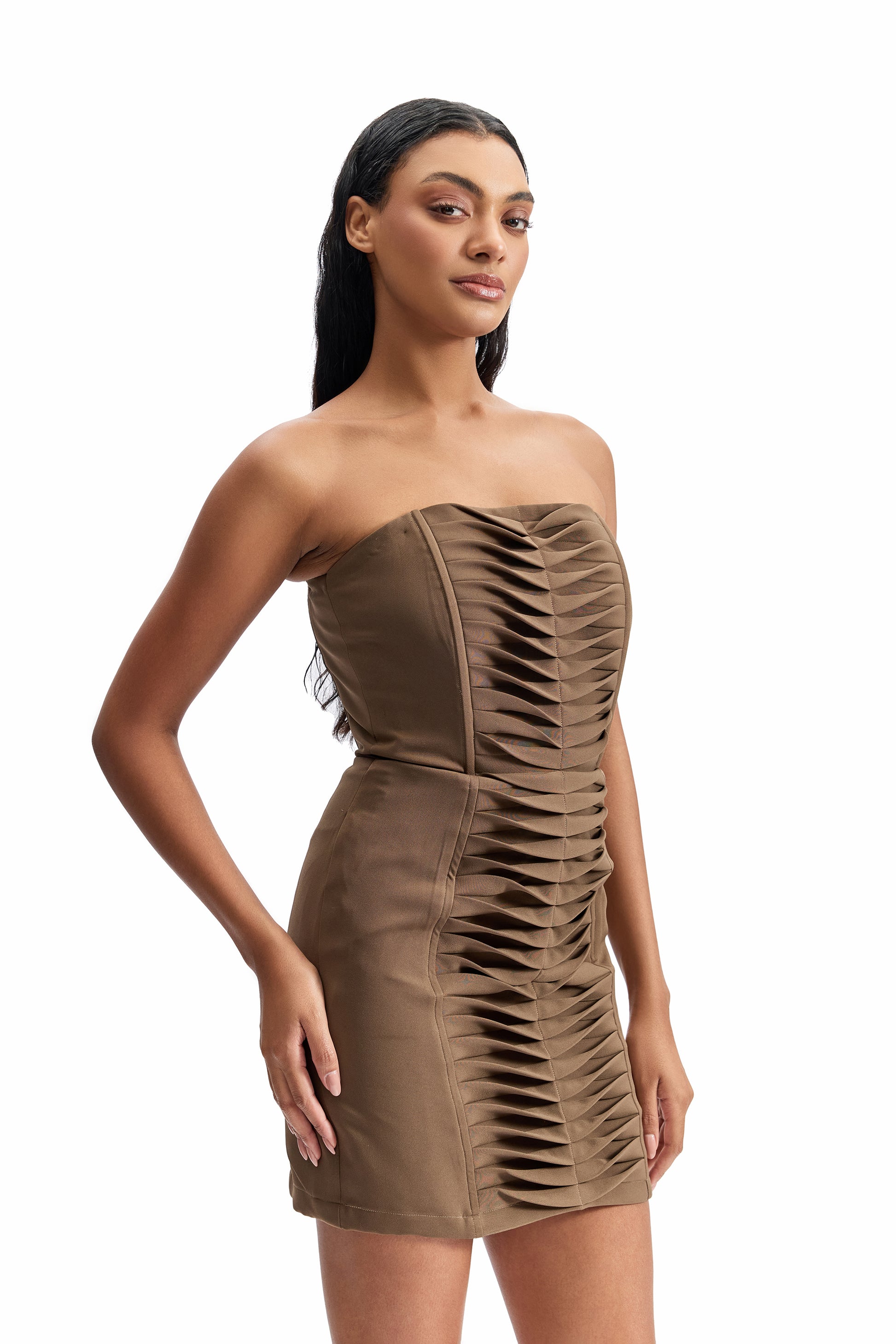 A sculpted strapless mini dress engineered to contour the body with architectural precision. Designed with sharp, symmetrical pleating through the center panel, this piece creates a strong vertical rhythm that enhances structure while elongating the silhouette.