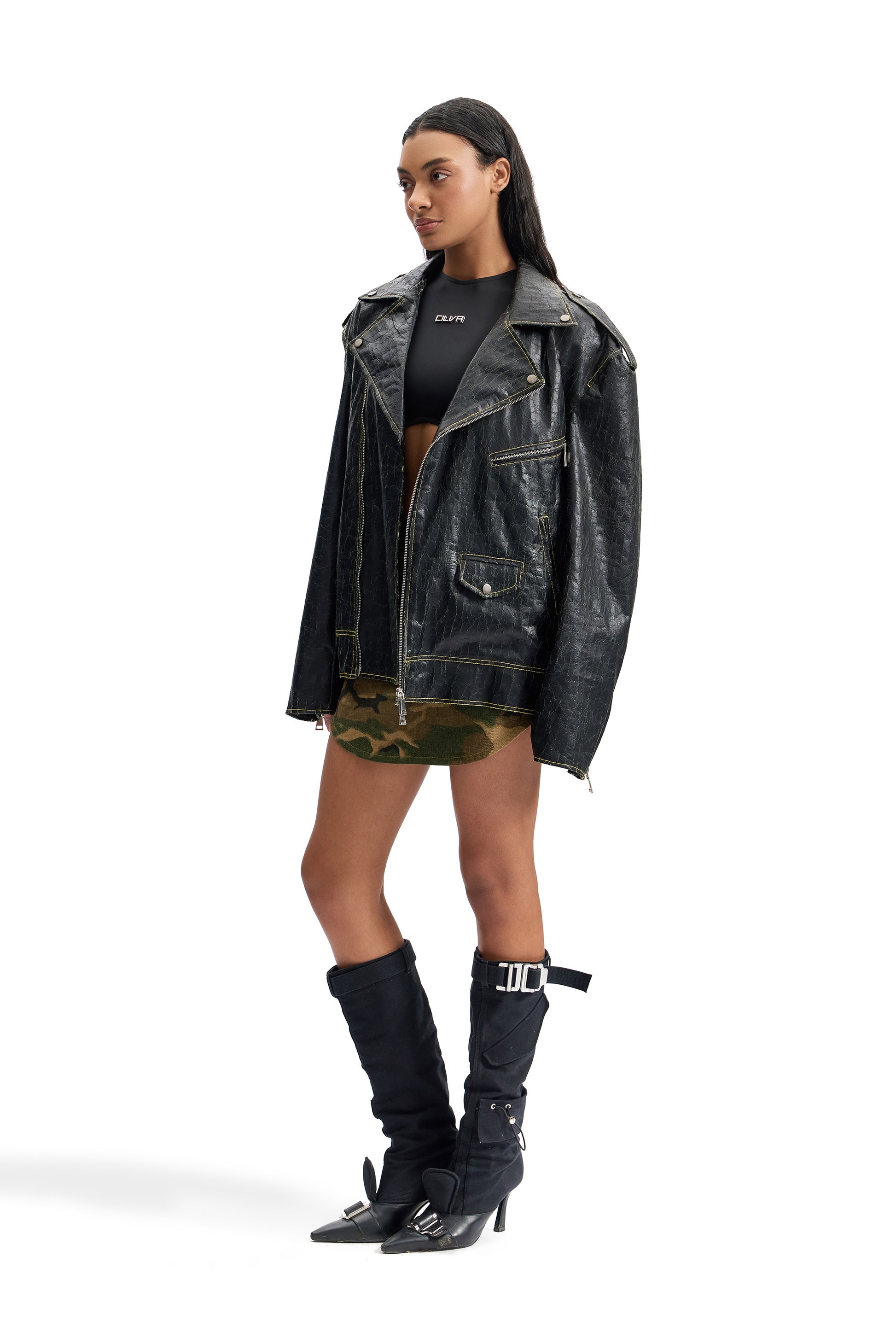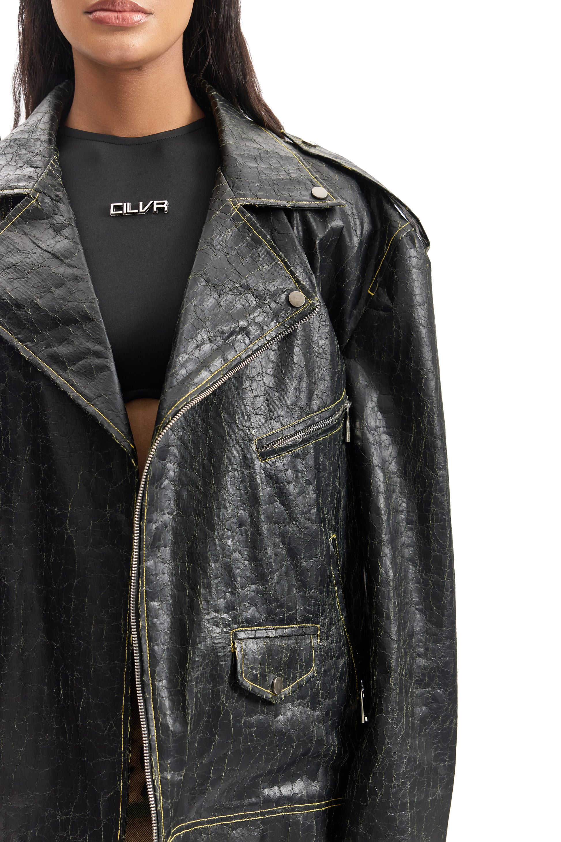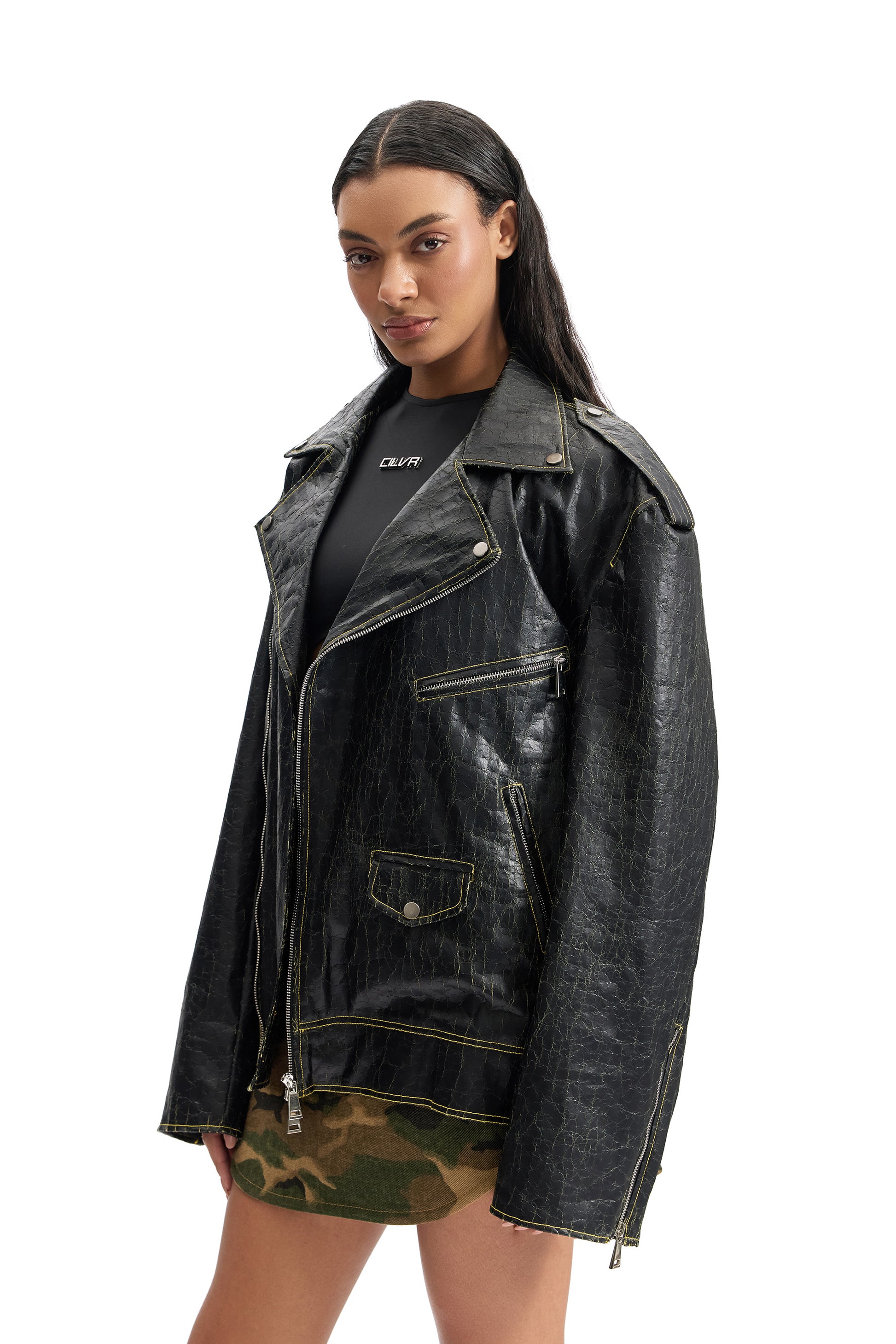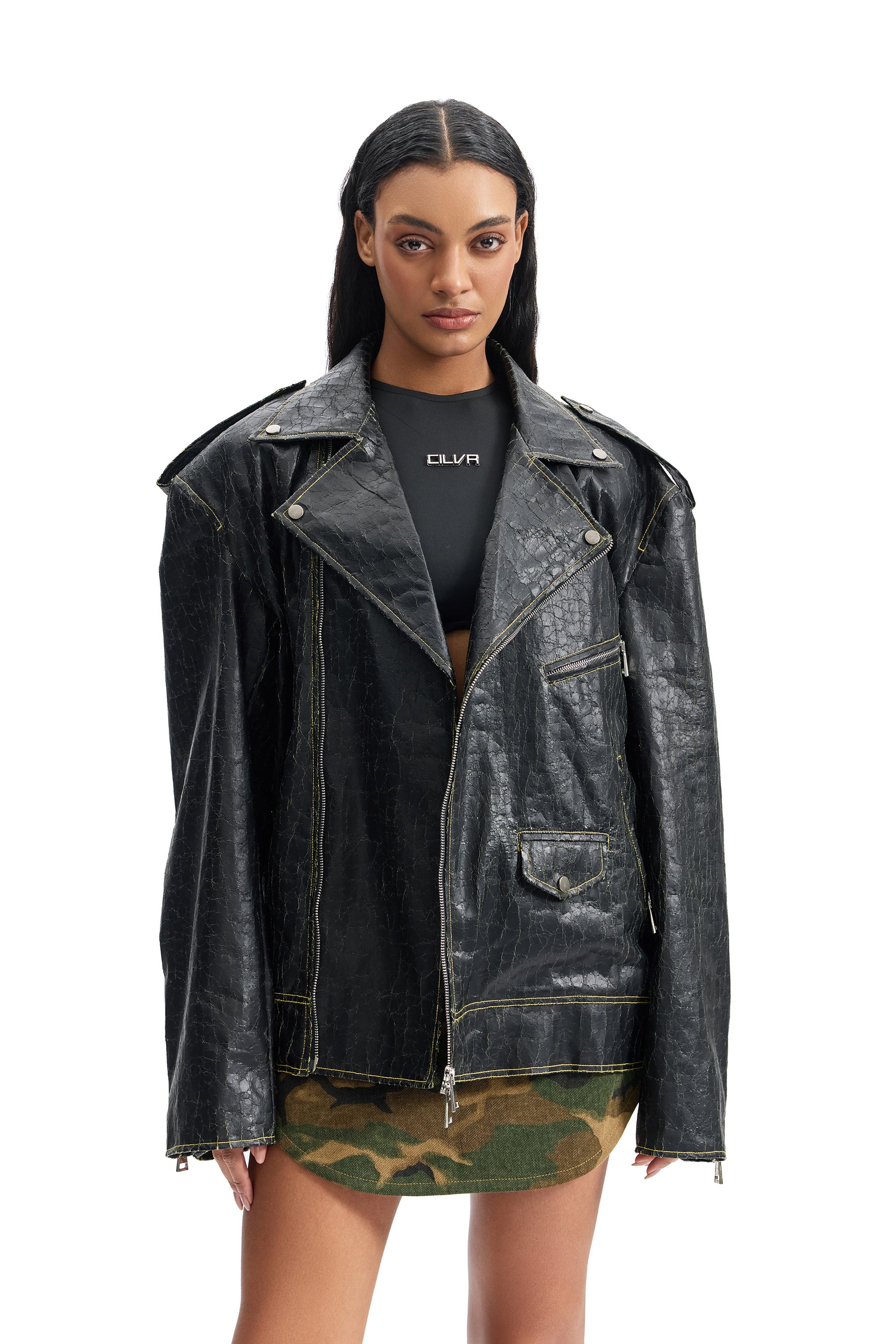 A bold reinterpretation of the classic moto silhouette, this biker jacket is crafted in distressed cracked leather for a rugged, lived-in character. Designed with an oversized structure and industrial detailing, it delivers strong attitude while maintaining a refined, fashion-forward edge.