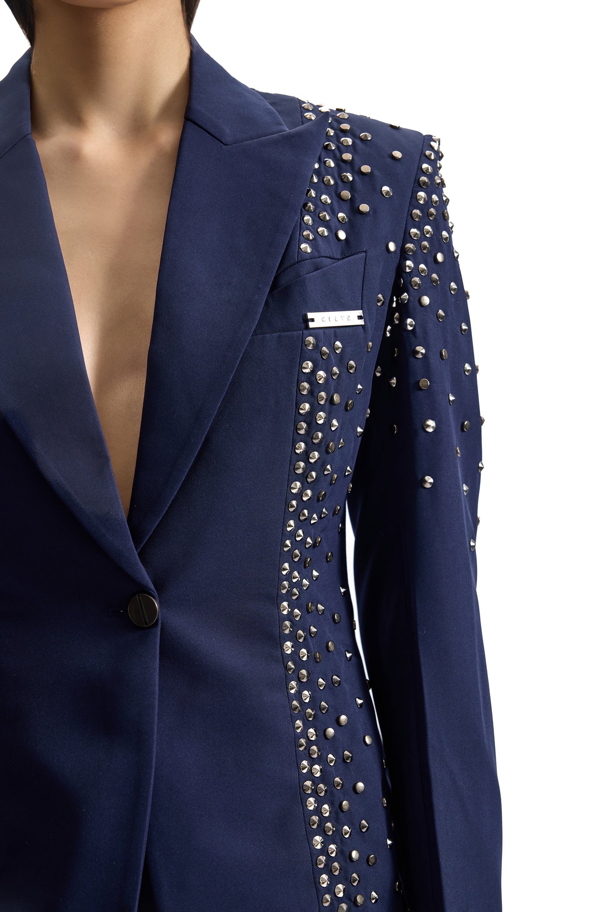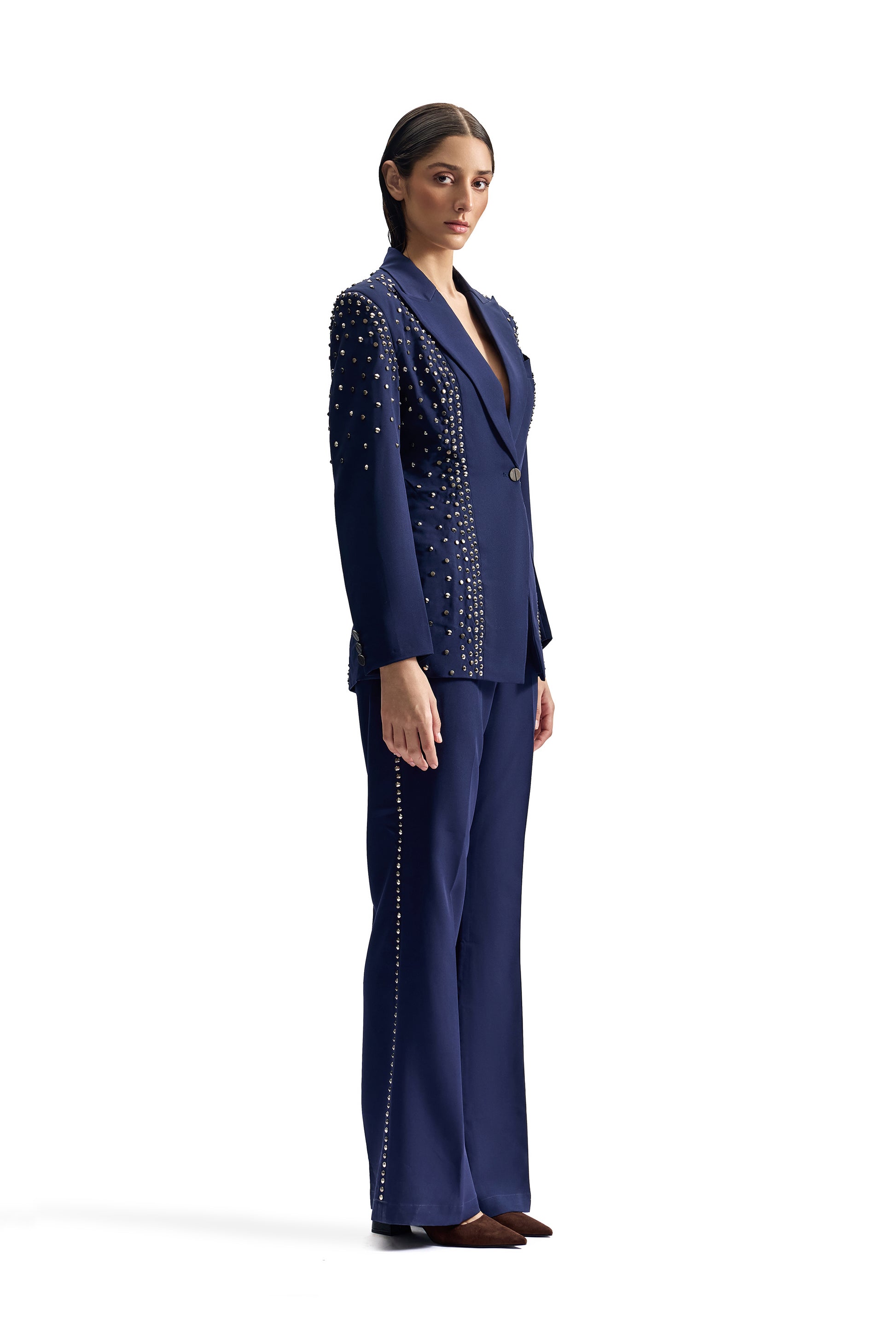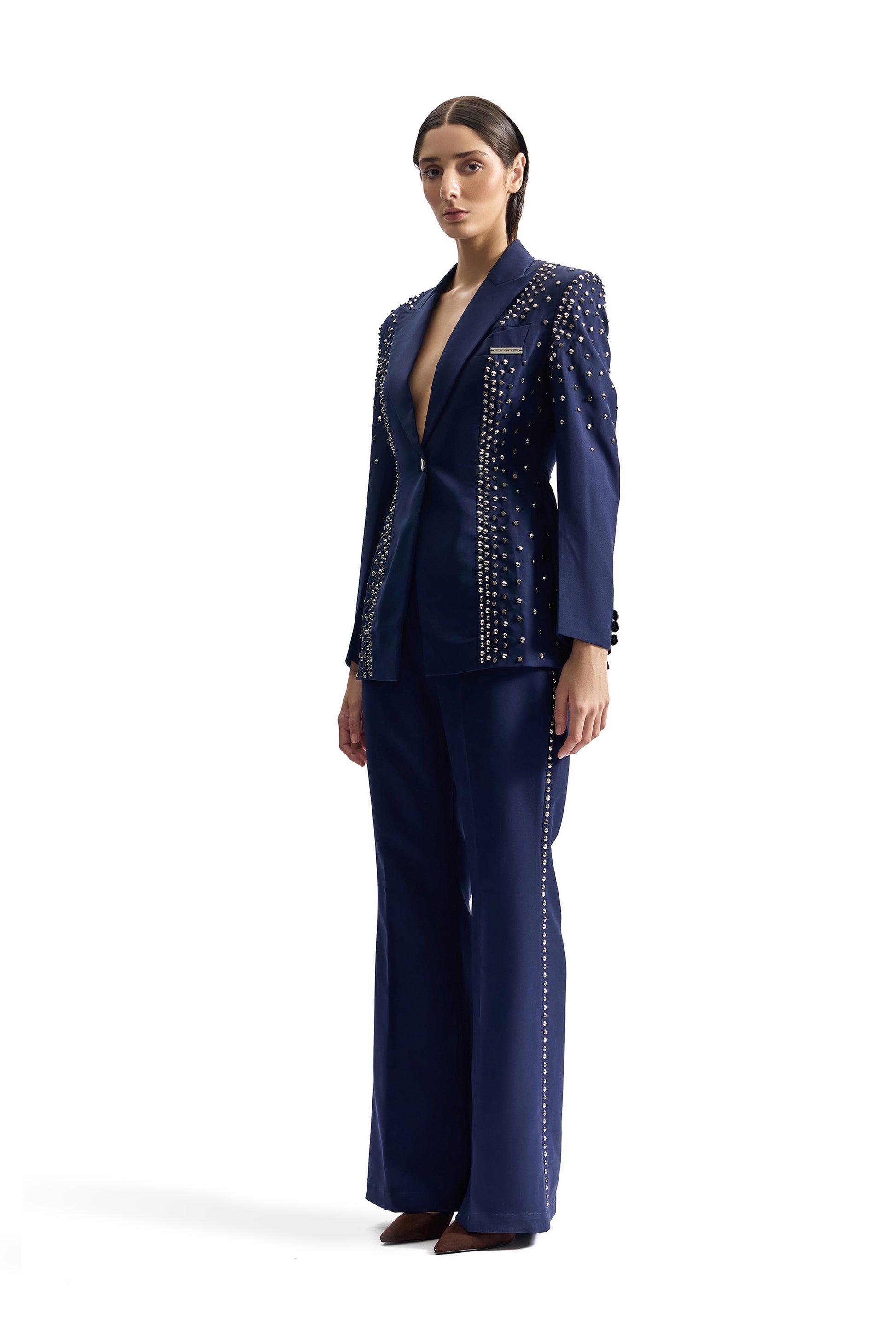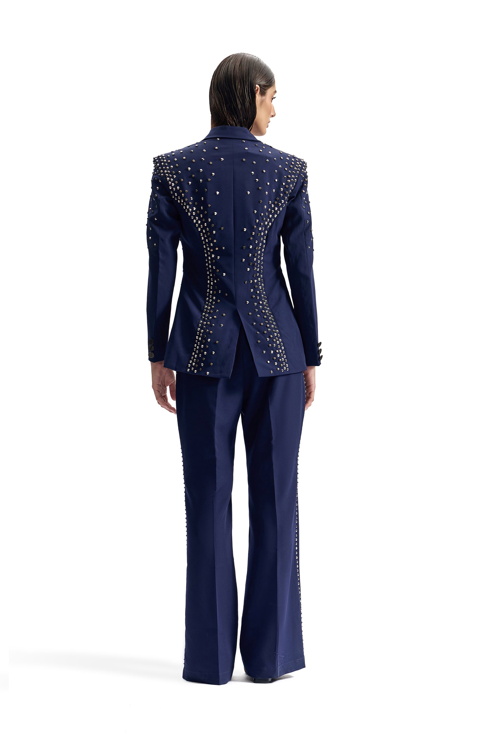 A sharply tailored navy suit elevated with metal-studded hand embroidery. Engineered for a sculpted, commanding silhouette.