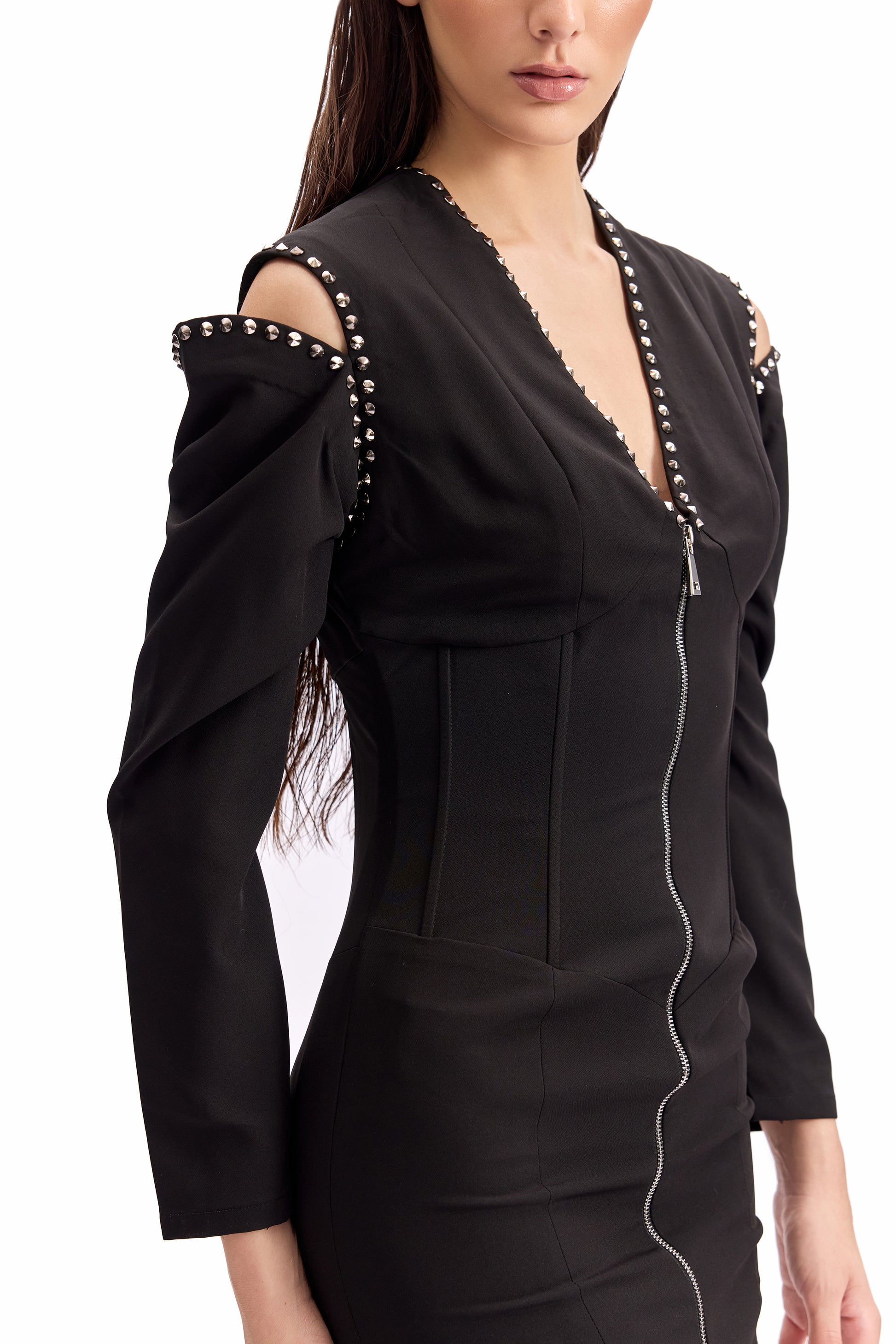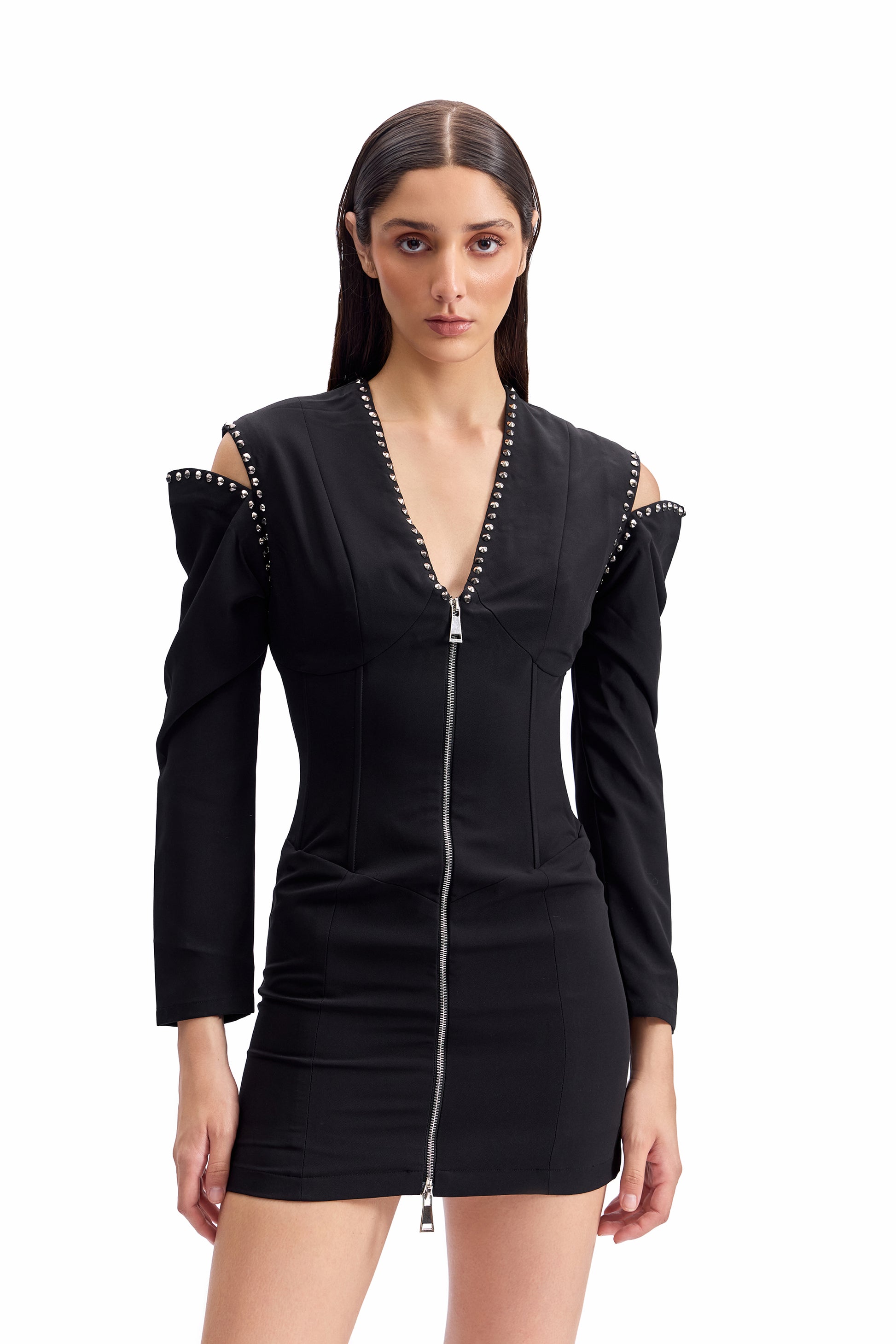 A sharply sculpted mini dress engineered to command attention.The cold-shoulder construction exposes the frame with intention, while hand-applied metal studs trace the neckline and shoulders for controlled impact. An exposed front zip runs through the centre, allowing adjustable styling—from sharp and restrained to unapologetically bold.
