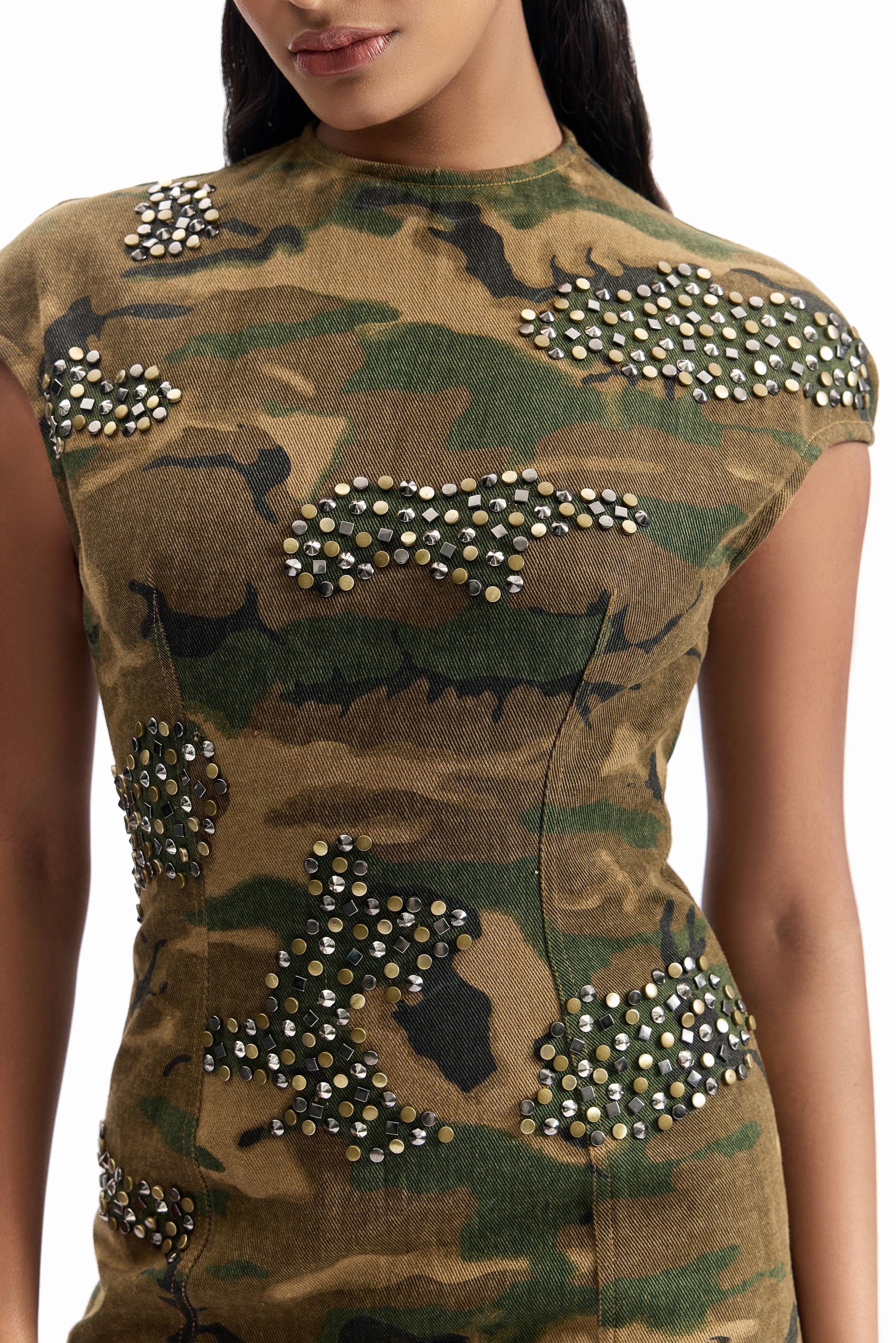 A body-contouring mini dress crafted in olive camouflage fabric, elevated with hand-applied stud embroidery. Designed with powerline shoulders and engineered structure, this piece fuses strength, precision, and statement femininity.